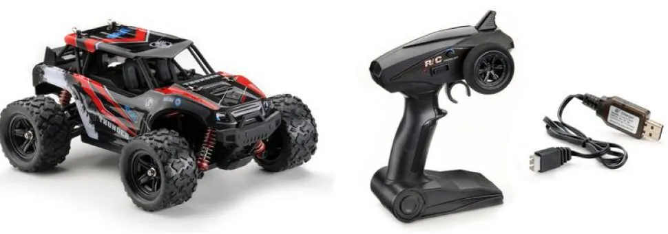 Cette voiture télécommandée s’adresse aux débutants mais dispose de caractéristiques excellentes : transmission 4×4 pour une utilisation sur tout type de terrain, 4 suspensions indépendante permettant une bonne tenu de route, une motorisation puissante Brushed 380 avec un ESC 30A, associée à une batterie Li-ion 2S 7.4V offrant une vitesse de pointe de plus de 30km/h, pas mal du tout sur cette échelle 1:18 !