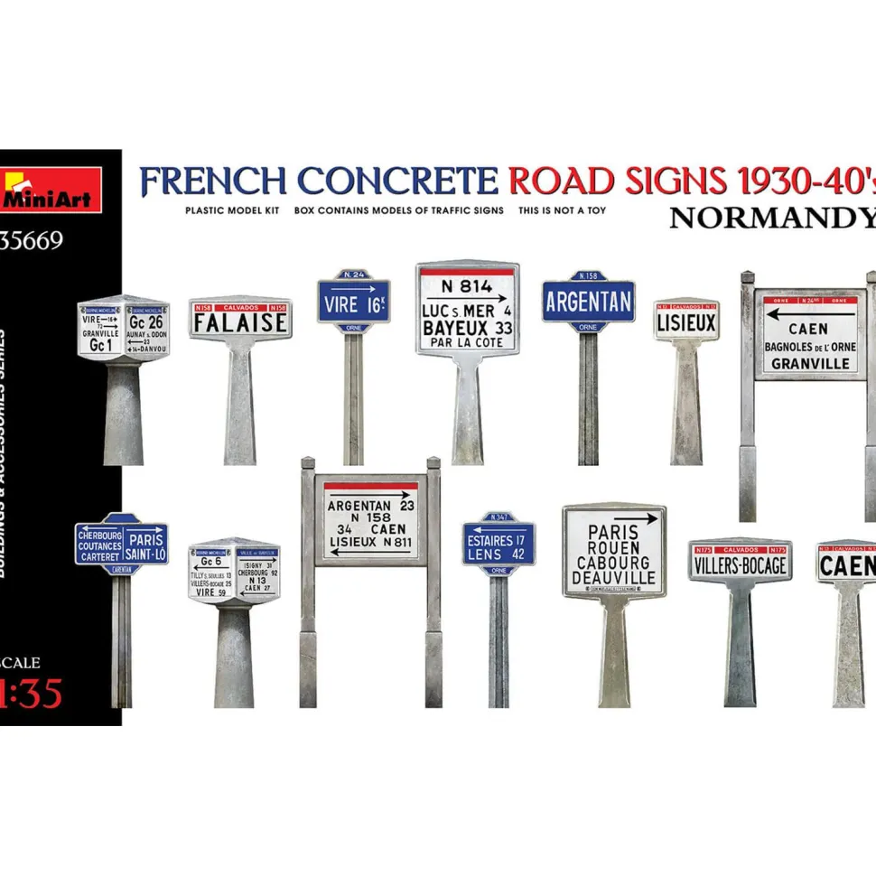 Accessoires pour diorama à assembler, de la marque MiniArt : Panneaux routiers français en béton des années 1930-40, Normandie. Échelle : 1/35.