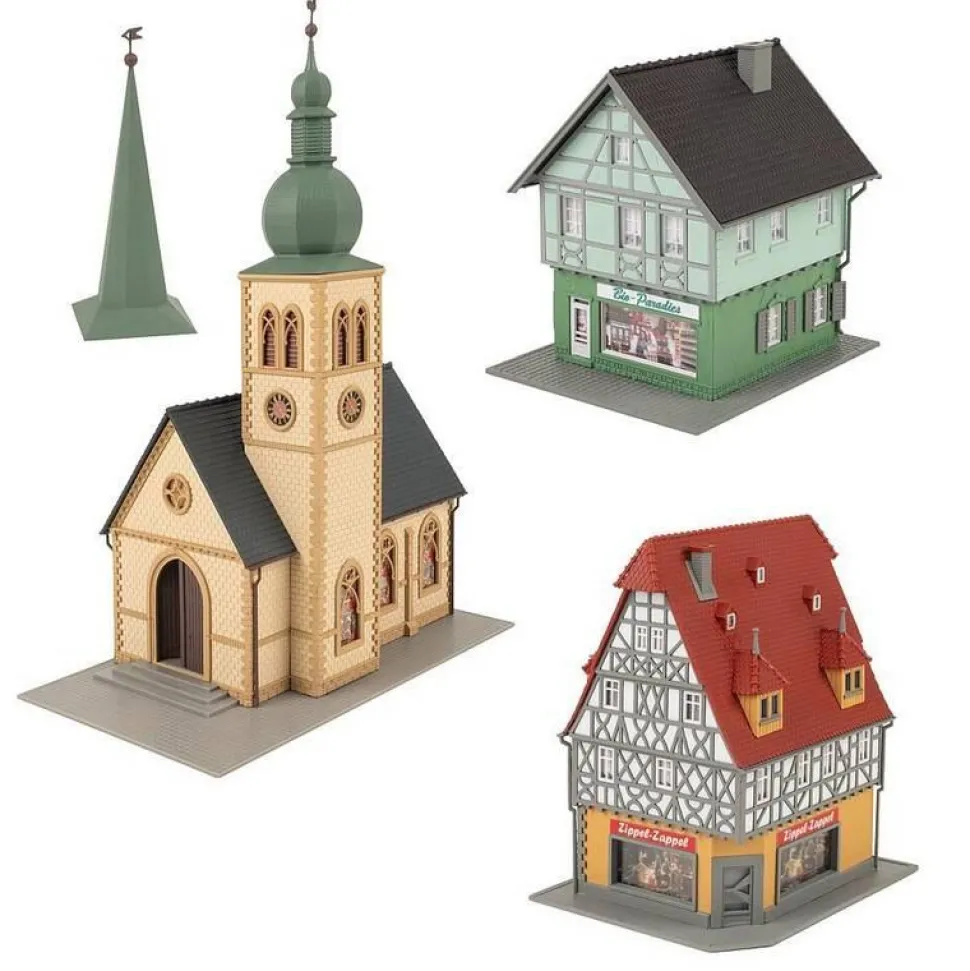 Ce set enchanteur vous emmène dans un monde idyllique de maquettes pleines de charme pittoresque. Il comprend une église typiquement rurale avec des vitraux artistiques et une flèche interchangeable (2 inclus) ainsi que deux magasins à colombages colorés : un magasin bio dans des tons menthe doux et un magasin de jouets jaune vif. Plongez dans l’atmosphère calme et accueillante de la vie à la campagne et profitez des scènes enchanteresses de ce village miniature !