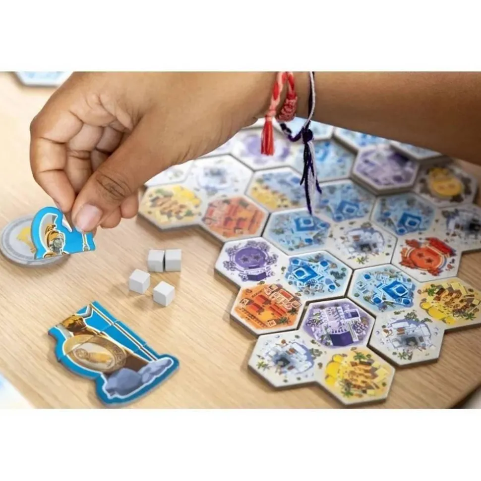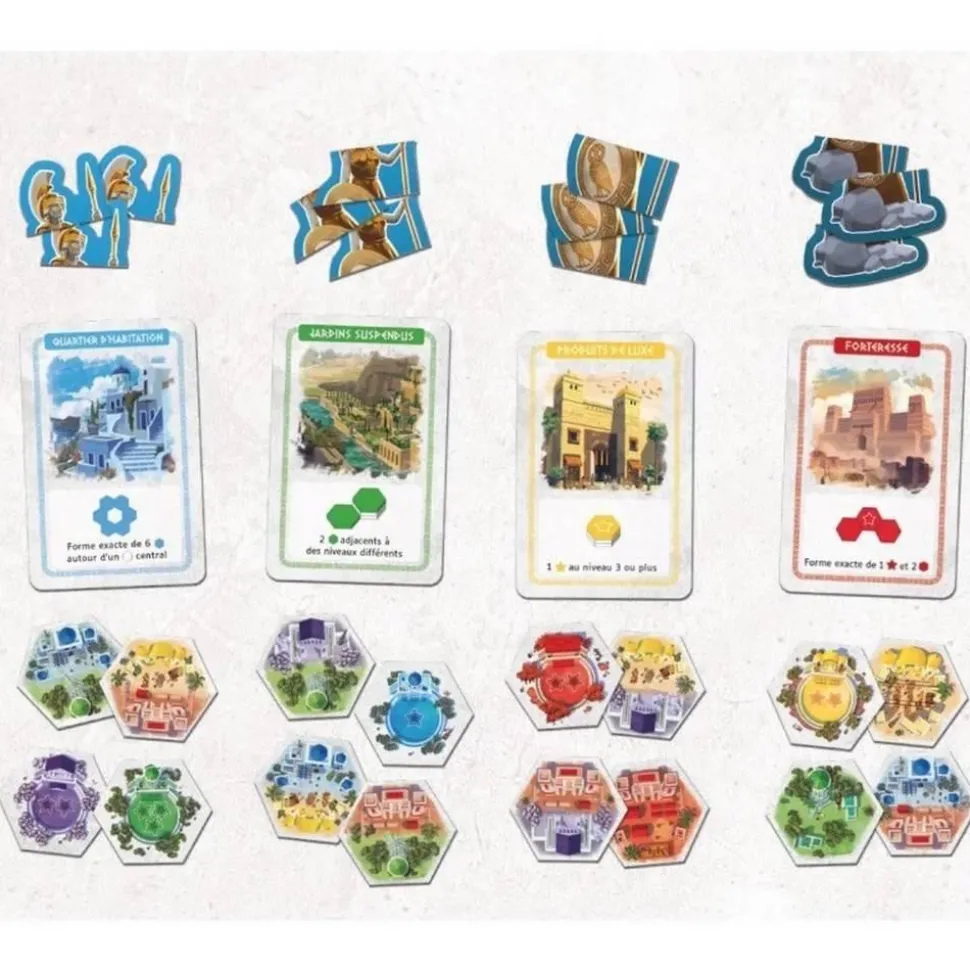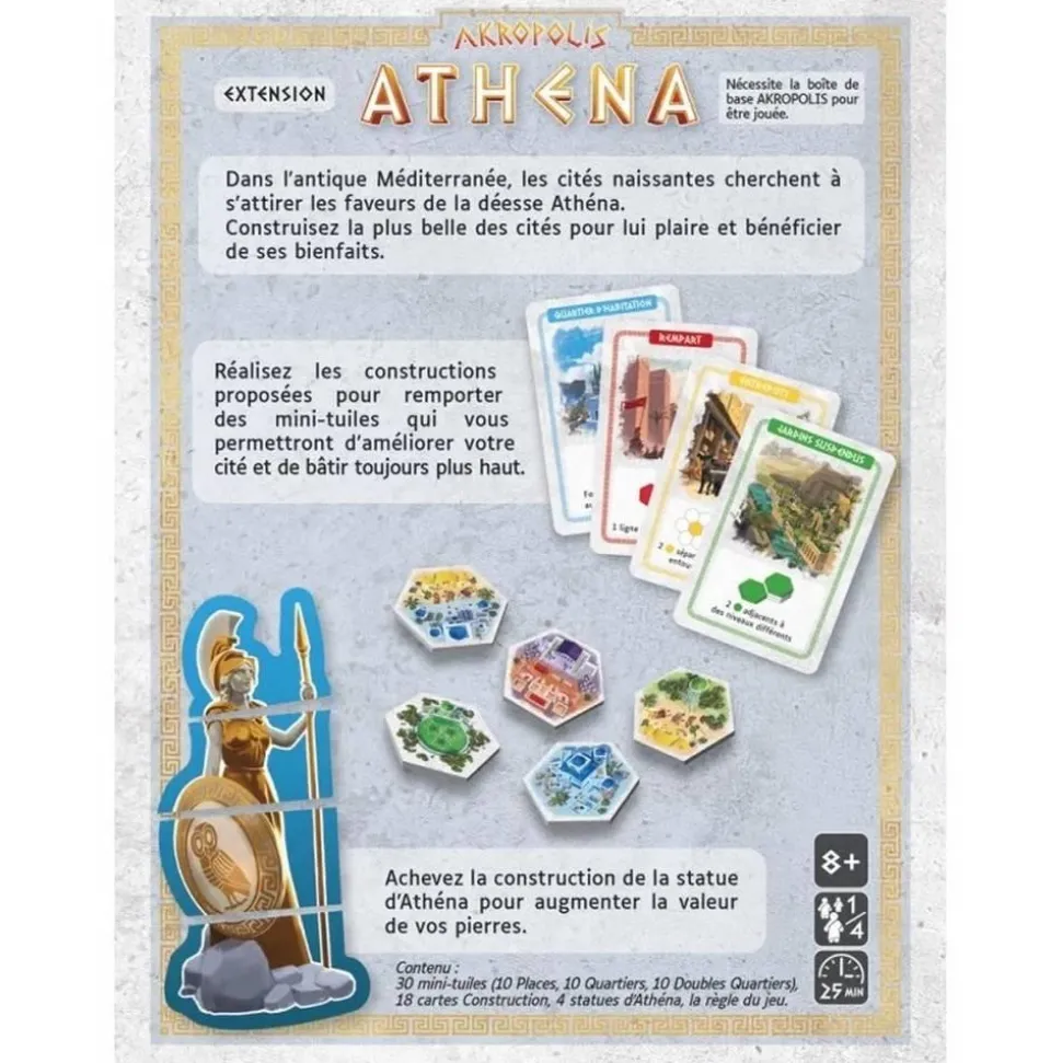 Contenu : 18 cartes Construction, 30 mini-tuiles (10 Places, 10 Quatiers, 10 Doubles-Quartiers), 4 statues d’Athéna composées de 4 parties chacunes, la règle du jeu