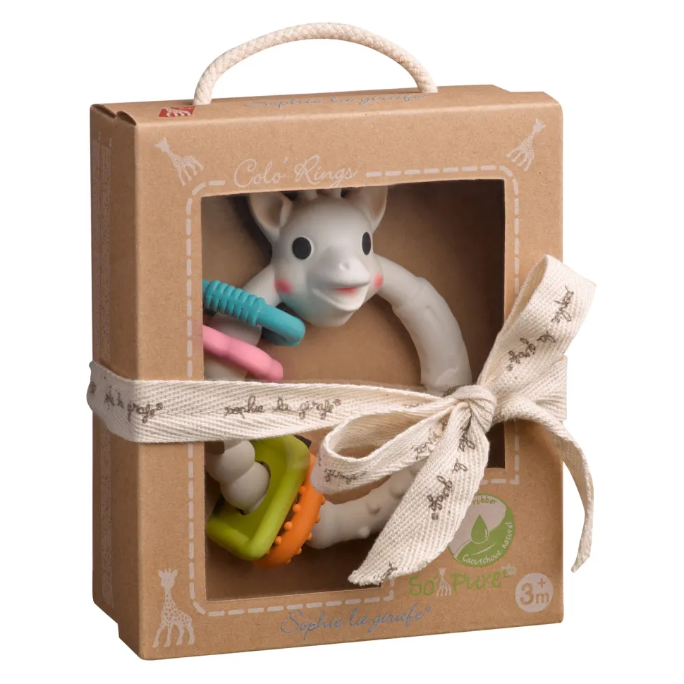 Un anneau de dentition avec anneaux colorés, à l’effigie de Sophie la girafe, pour soulager les poussées dentaires des tout-petits avec l’un de ses compagnons préférés !Cette boîte comprend un anneau avec la tête de Sophie la girafe, en caoutchouc 100% naturel, issu du latex de l’hévéa et de peinture alimentaire, auquel sont accrochés quatre anneaux colorés. Les nombreuses parties souples à mordiller et les textures variées (picots arrondis, surfaces striées, oreilles et cornes) offrent à bébé différents massages et soulagent efficacement les gencives. Léger et ergonomique, ce jouet est facile à prendre à main et les différentes formes et couleurs inciteront votre enfant à le secouer et à jouer à faire coulisser les anneaux autour de l’anneau principal.Dimensions de la boîte : 17 x 14 x 7 cm.