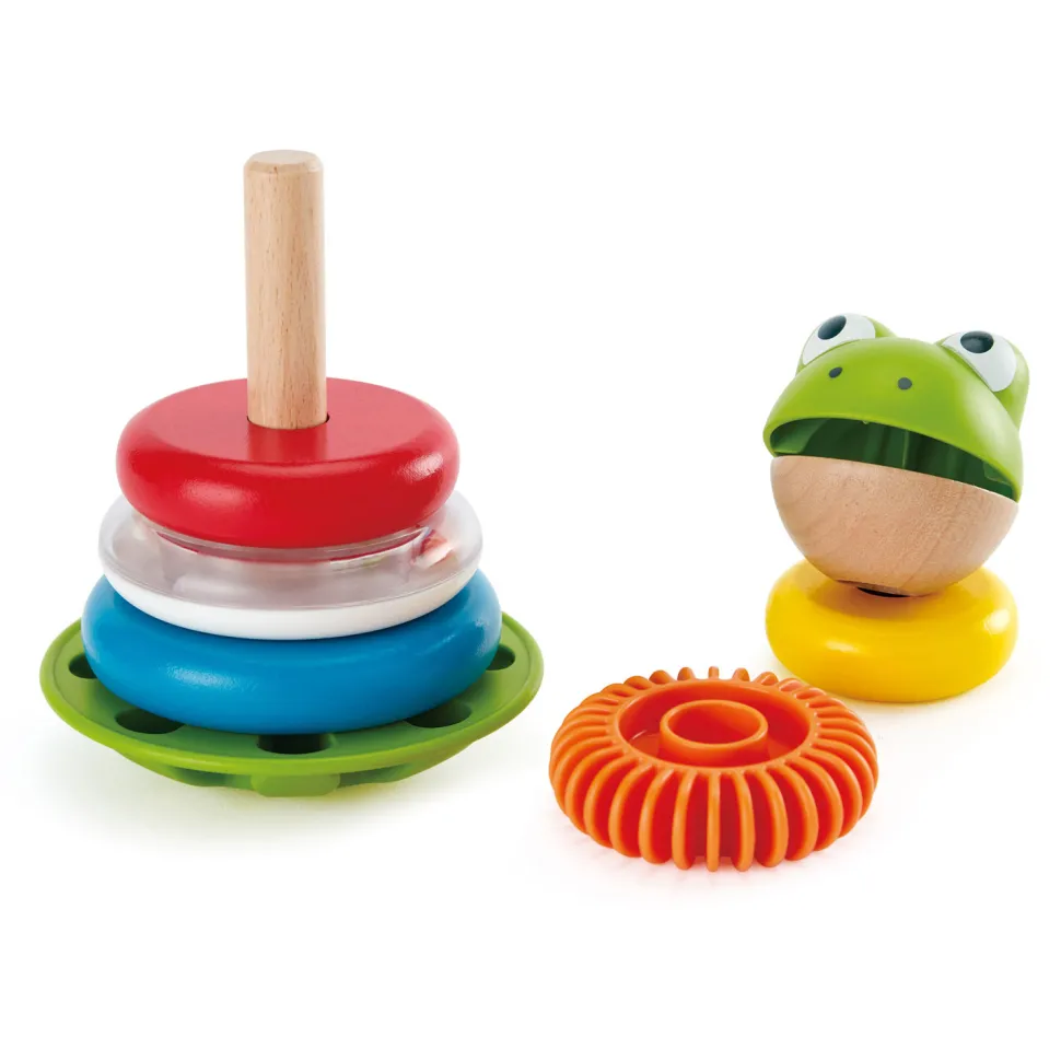 M. Grenouille est un jouet tout-en-un pour développer l’éveil des tout-petits à partir de 12 mois.Ce jouet se compose d’une base avec une tige verticale en bois, sur laquelle l’enfant viendra empiler des anneaux colorés en plastique du plus grand au plus petit, et une tête de grenouille.Le but pour votre enfant, essayer d’empiler M. Grenouille, mais ce n’est pas tout ! En empilant les anneaux sur la base il pourra entendre différents sons. En plus d’aider à développer la motricité fine des enfants, M. Grenouille les aide ainsi à apprendre les couleurs, les sons et à compter !Dimensions du jouet : 4,7 x 4,7 x 7,3 cm.