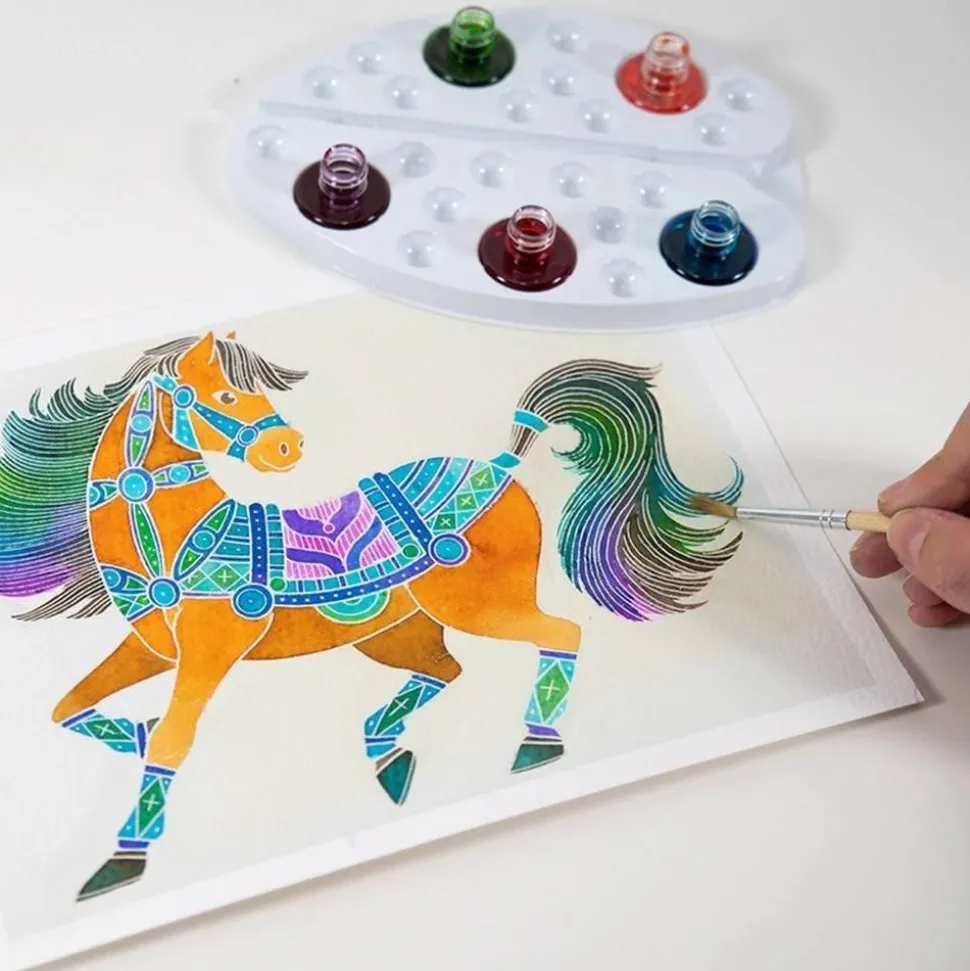 Aquarellum Junior – Chevaux Idéal pour les premiers coups de pinceaux des enfants, Aquarellum Junior est basé sur la technique de sertissage de papier vélin qui ne laisse la peinture adhérer que sur les surfaces réservées : le motif apparaît au fur et à mesure du passage du pinceau et peut être repeint jusqu’à l’obtention de l’harmonie parfaite. Une activité idéale pour comprendre le mélange des couleurs, stimuler l’imaginaire, la concentration et initier les enfants à l’art. Contenu de la boîte : – 4 tableaux sertis 18 x 25 cm, – 1 pinceau de grande qualité, – 1 palette pour réaliser ses gammes de couleurs, – 5 flacons d’aquarelles non toxiques, – 1 pipette pour doser les aquarelles, – 1 notice explicative pour créer toutes les couleurs. Dimensions de la boîte : 26.5 x 19.5 x 3 cm.Ce coffret est idéal pour passer de beaux moments de créativité avec l’enfant. Il sera fier de réaliser de jolies aquarelles par lui-même. Une fois son chef d’oeuvre terminé, vous pourrez l’accrocher dans la maison. Il apportera une jolie touche colorée sur vos murs.