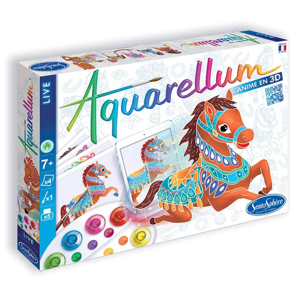 Aquarellum s’anime en 3D ! Après avoir peint les 4 chevaux du coffret en profitant de la technique magique d’Aquarellum de Sentosphère, scanne-les grâce à une application qui donnera vie à tes mises en couleurs et te permettra de te prendre en photo avec !