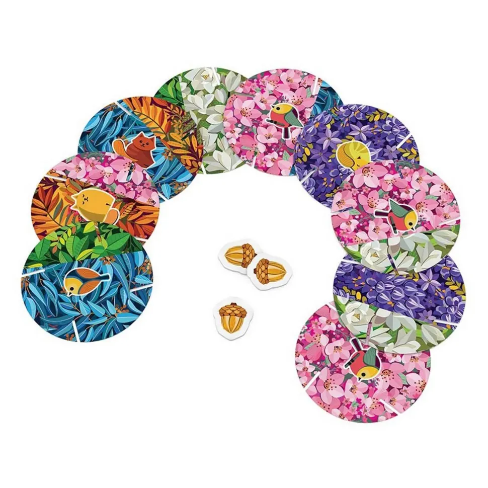 Contenu : 54 cartes (chacune comportant 1, 2 ou 3 zones de couleur), 2 Arbres en carton (dont 1 arbre de rechange), 14 jetons Gland, 6 jetons Effet et 1 livret de Règles
