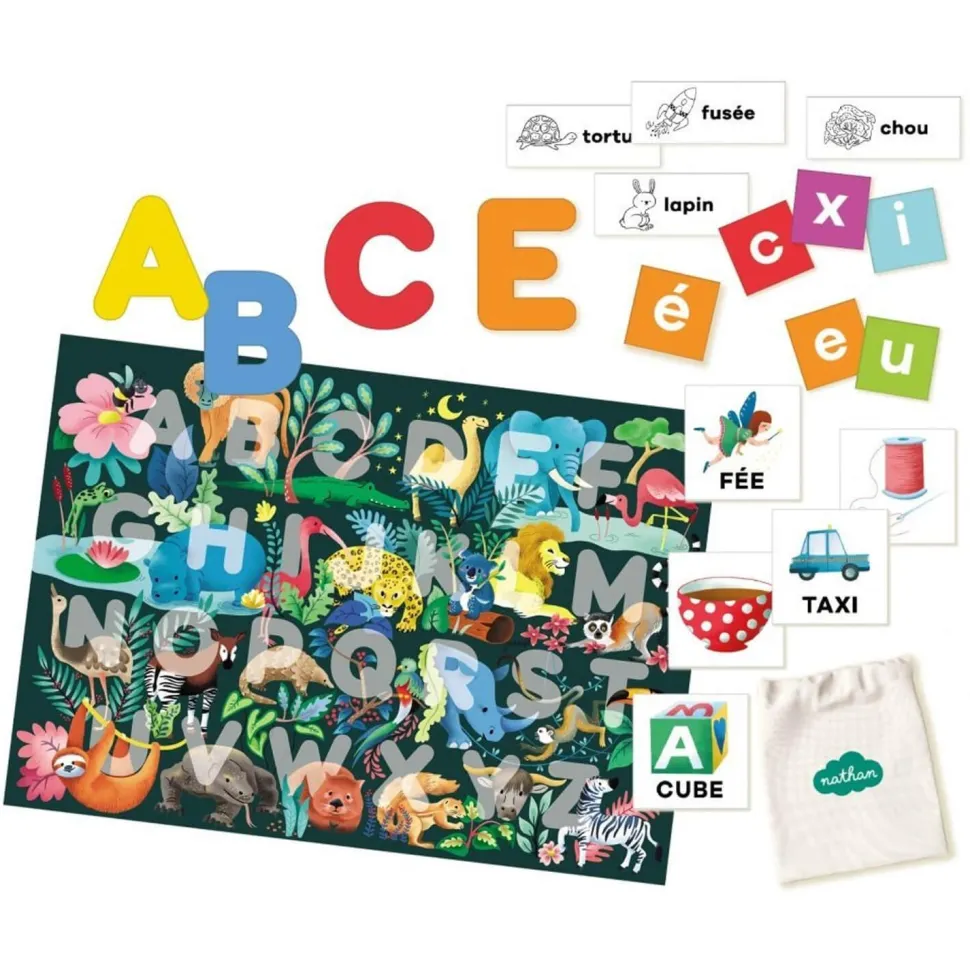 Contenu : 27 lettres en carton à la forme, 80 jetons lettres minuscules, 40 cartes images et mot, 80 étiquettes « images et mots » , 1 grand poster abécédaire (dimensions 42 x 59 cm), 1 petit sac en coton, instructions 20 pages.