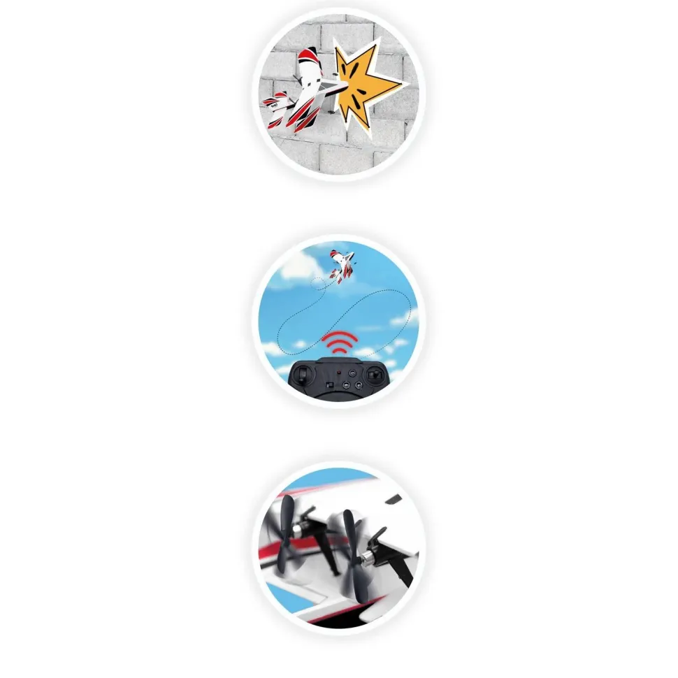 L’avion fonctionne sur batterie lithium 3.7V et se recharge grâce au câble USB inclus. La radiocommande a une portée de 40 mètres et nécessite 3 piles LR06-AA non incluses.