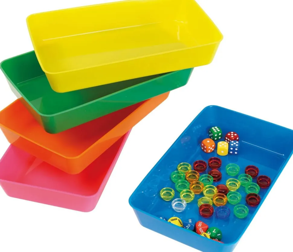 … Les bacs à matériel en matière synthétique incassable permettent de ranger à portée de main du matériel pédagogique, des petites pièces, des fournitures de bureau, du matériel de bricolage, des stylos et crayons, des accessoires de jeux éducatifs et bien plus encore. Ils sont également parfaits pour les jeux de comptage et de tri. Lot de 5 bacs en 5 couleurs. Livré vide.
