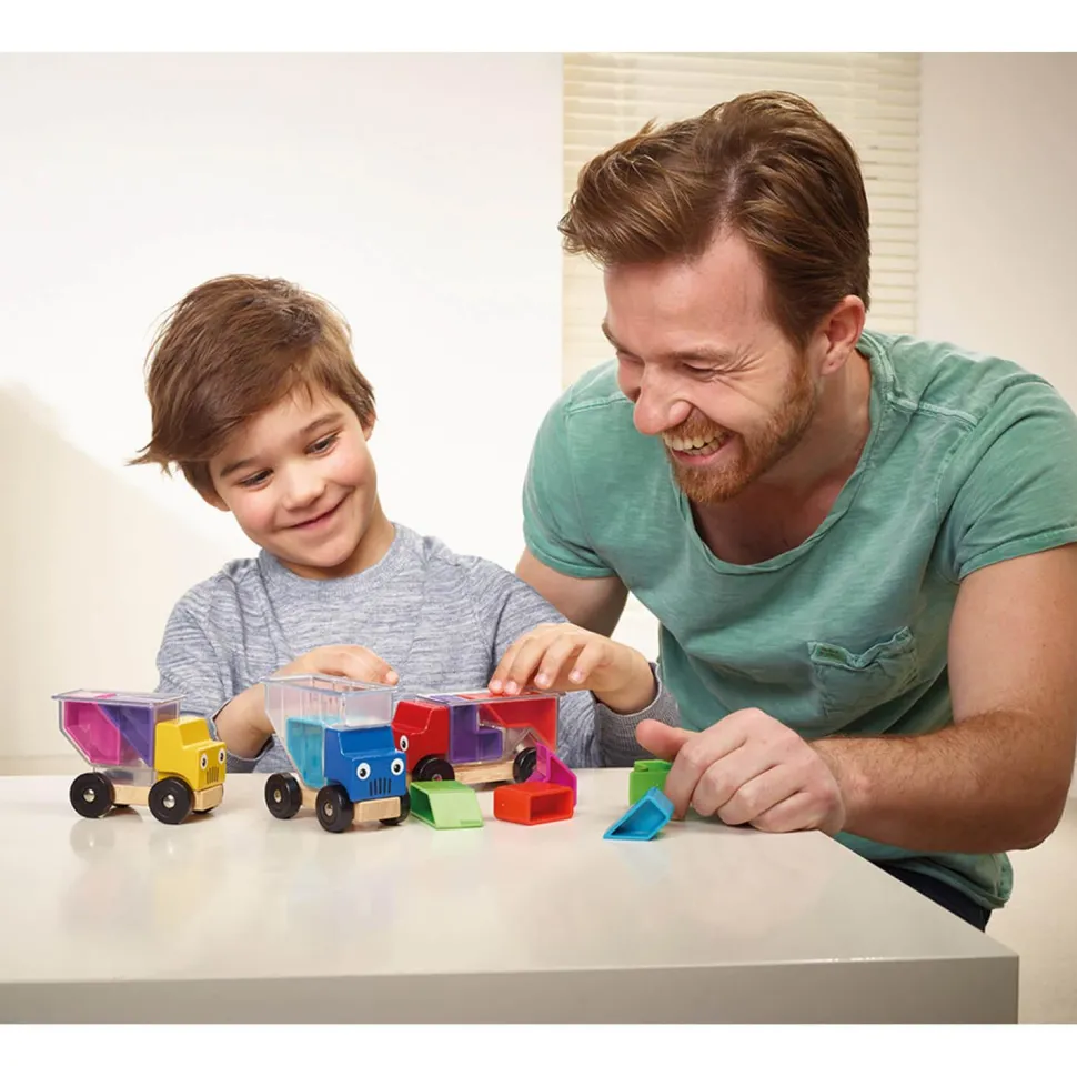 Embarquez vos colis et roulez vers d’autres aventures ! Bahuts Malins est un jeu de logique pour un joueur de 3 à 8 ans, qui propose 48 défis et 4 niveaux de difficulté.Contenu :- 3 camions en bois- 10 colis en plastique- 1 livret contenant 48 défis et toutes les solutions.Les trois camions Groseille, Citron et Pruneau sont en chemin vers leur prochaine destination. Ils doivent transporter des affaires, mais ils ne savent pas si elles tiendront toutes dans leurs bennes transparentes. Pouvez-vous les aider à tout emporter ?Bahuts Malins est un jeu évolutif. Petit, il considérera les camions en bois comme des jouets qu’il pourra remplir et déplacer. En grandissant, il voudra relever les 48 défis et commencera par le premier niveau de difficulté pour finir avec le plus gros.