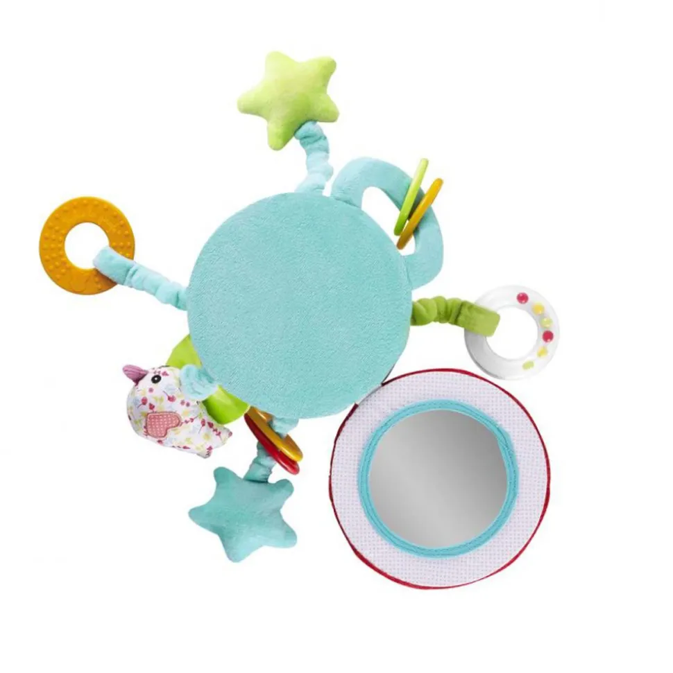 Sophie la girafe n’a pas fini de réserver des surprises aux petits avec cette balle d’activités !Adapté pour les bébés dès la naissance, ce jouet combine différentes textures, couleurs et activités idéales pour son éveil.Formé comme une balle assemblée de deux parties, ce jouet se compose de parties en tissu ou en velours doux que bébé adorera manipuler. Il propose aussi de multiples activités qui l’aideront dans son développement : un miroir pour se regarder, un hochet à manipuler, une boite à musique, du papier crissant, et des billes qui s’entrechoquent qu’il ne se lassera par d’écouter et même un anneau à mordiller lors de ses poussées dentaires. Rattachée à un anneau, cette balle surprise pourra être suspendue sur tous les supports, à la poussette, ou bien au lit.