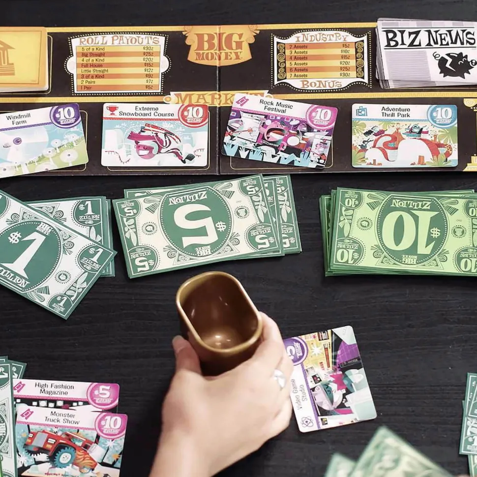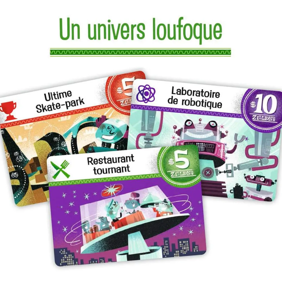 Amassez des sommes colossales … et soyez le plus riche à la fin ! Lancez les dés jusqu’à 3 fois et récupérez un max d’oseille : un full vous rapportera 15 Zillions, une grande suite 25 ! Ayez du flair et investissez dans les affaires qui rapportent pour développer votre empire. Allez-vous miser sur votre équipe de foot préférée, un fabuleux parc d’attraction ou un nouveau studio de cinéma ? À vous de décider ! À vous de prendre les bons risques, car seul le plus riche l’emportera ! Avez-vous l’étoffe d’un zillionnaire ?
