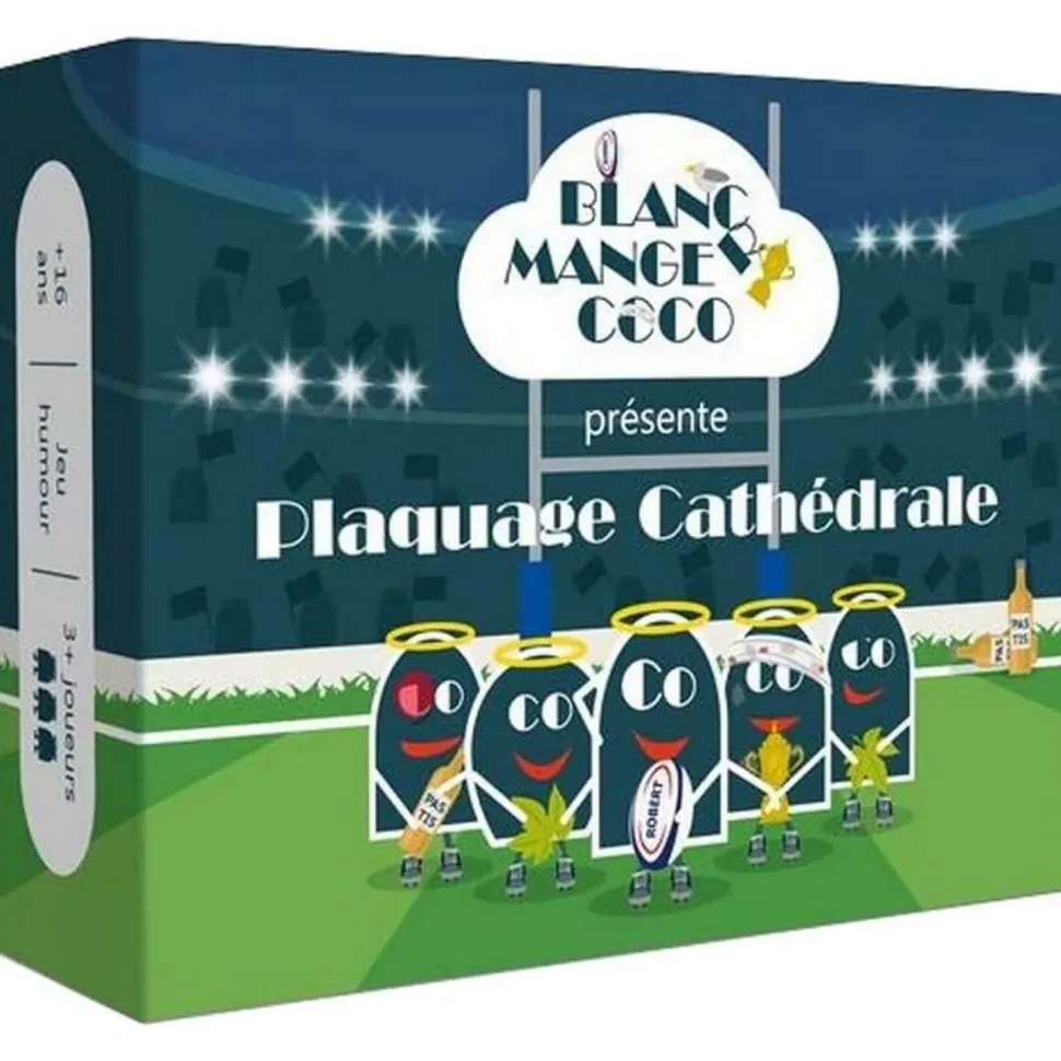 Plaquage Cathédrale est une extension du jeu Blanc Manger Coco portant sur la thématique du Rugby. Comme le jeu de base votre but est de compléter les phrases à trou avec vos cartes, la combinaison la plus drôle remporte le point.