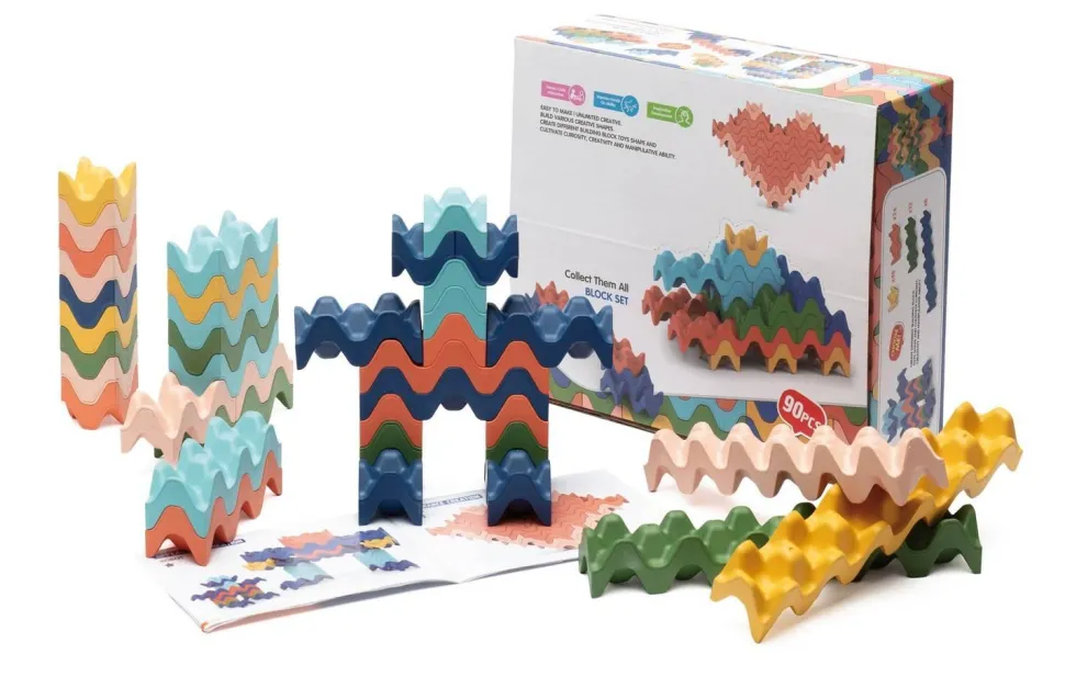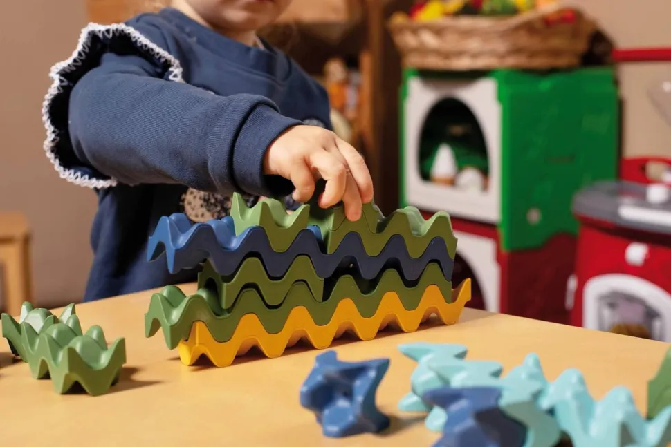Blocs de construction innovants pour une construction créative et un apprentissage créatif. Ce jeu de blocs de construction stimule l’imagination des enfants et favorise la reconnaissance ludique des motifs et des structures. Le design unique en forme de vague inspire des idées de construction innovantes et des constructions individuelles. Les enfants apprennent à relever les défis et à trouver des solutions grâce à l’imbrication harmonieuse des pierres. Ce processus stimule particulièrement la coordination œil-main et la persévérance. Instructions de montage incluses. Récompense : label Triman. 90 blocs de construction en vert, bleu, bleu clair, rose, orange, jaune et différentes tailles : 1, 2, 3 et 6 blocs. Matériau : 80 % polypropylène, 20 % paille de blé durable. Dimensions : plus petit bloc : 3 x 3 x 3 cm. Âge : à partir de 3 ans.