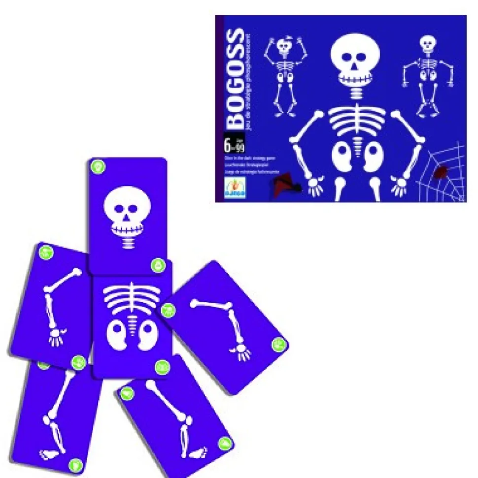 Bogoss de DjecoJeu de stratégie phosphorescent.Retrouver les 6 parties d’un squelette, quel drôle de défi… mais attention aux os cassés !Un jeu d’échange avec des cartes phosphorescentes pour jouer aussi dans le noir !Jeu de 62 cartes.De 2 à 4 joueurs.Durée d’une partie : 15 minutes.