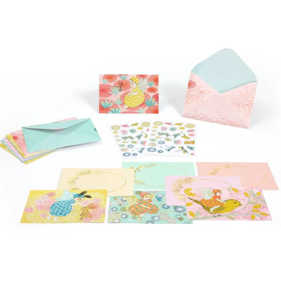 Contenu : 8 cartes illustrées, 8 enveloppes assorties, 2 planches de stickers