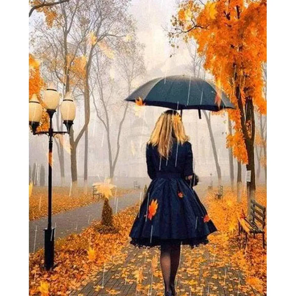 Caractéristiques détaillées : Broderie diamant : Femme sous la Pluie – toile tendue sur chassis