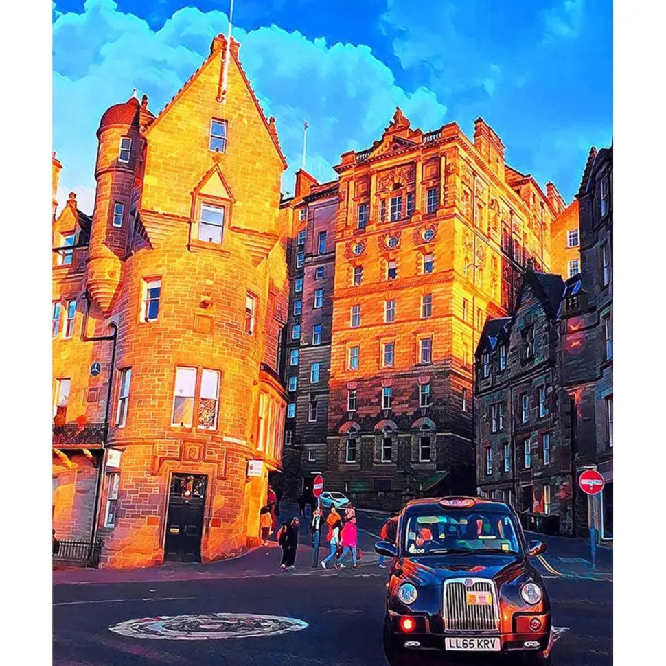 Description du produit : Broderie diamant : Rue Edinburgh – toile tendue sur chassis
