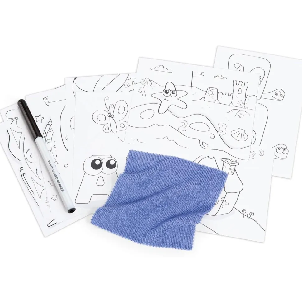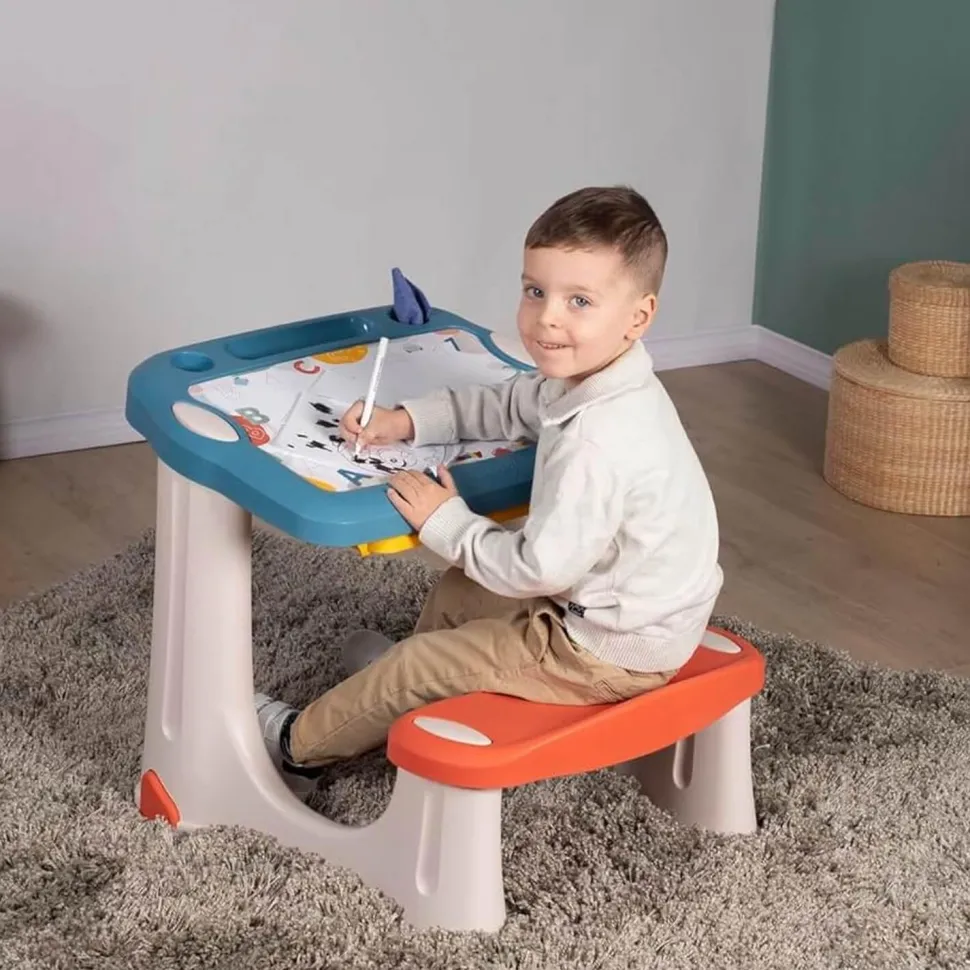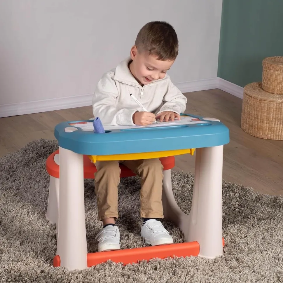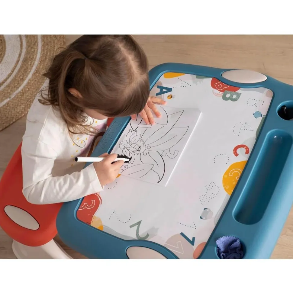 Son plateau, légèrement incliné et décoré, comporte une grande surface de dessin avec un IML pour pouvoir écrire au feutre effaçable, et 3 zones de rangement pour crayons et feutres. Il est possible d’y insérer 2 pots de peinture (non inclus).