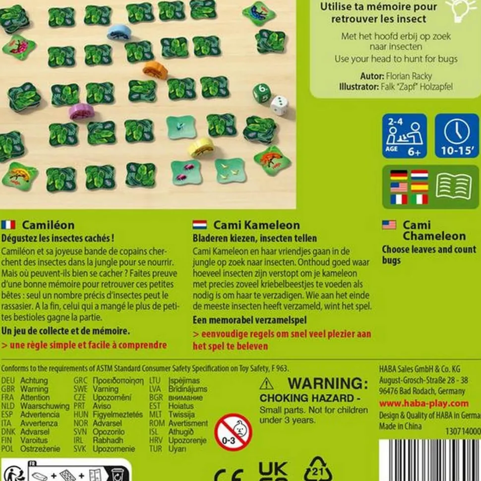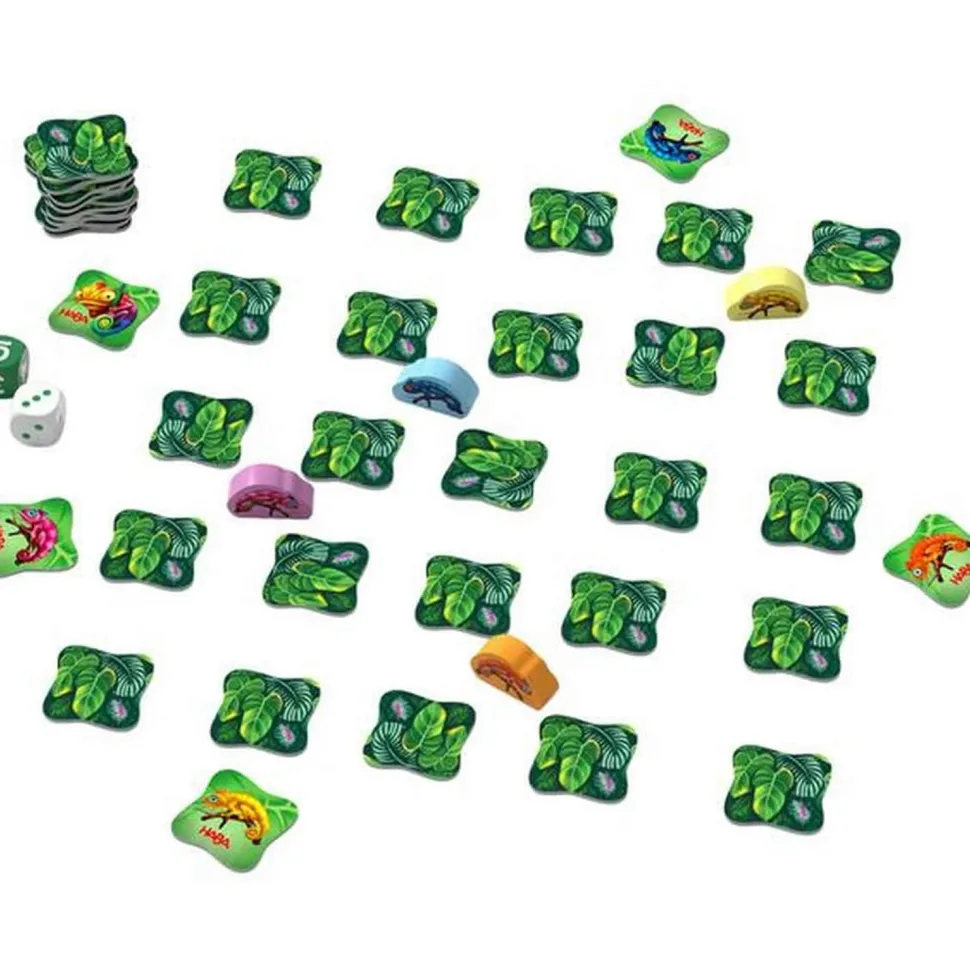 Camiléon et sa joyeuse bande de copains cherchent des insectes dans la jungle pour se nourrir. Mais où peuvent-ils bien se cacher ? Les joueurs doivent faire preuve d’une bonne mémoire pour retrouver ces petites bêtes afin de nourrir convenablement leur caméléon : seul un nombre précis d’insectes peut le rassasier. A la fin, celui qui a mangé le plus de petites bestioles gagne la partie.