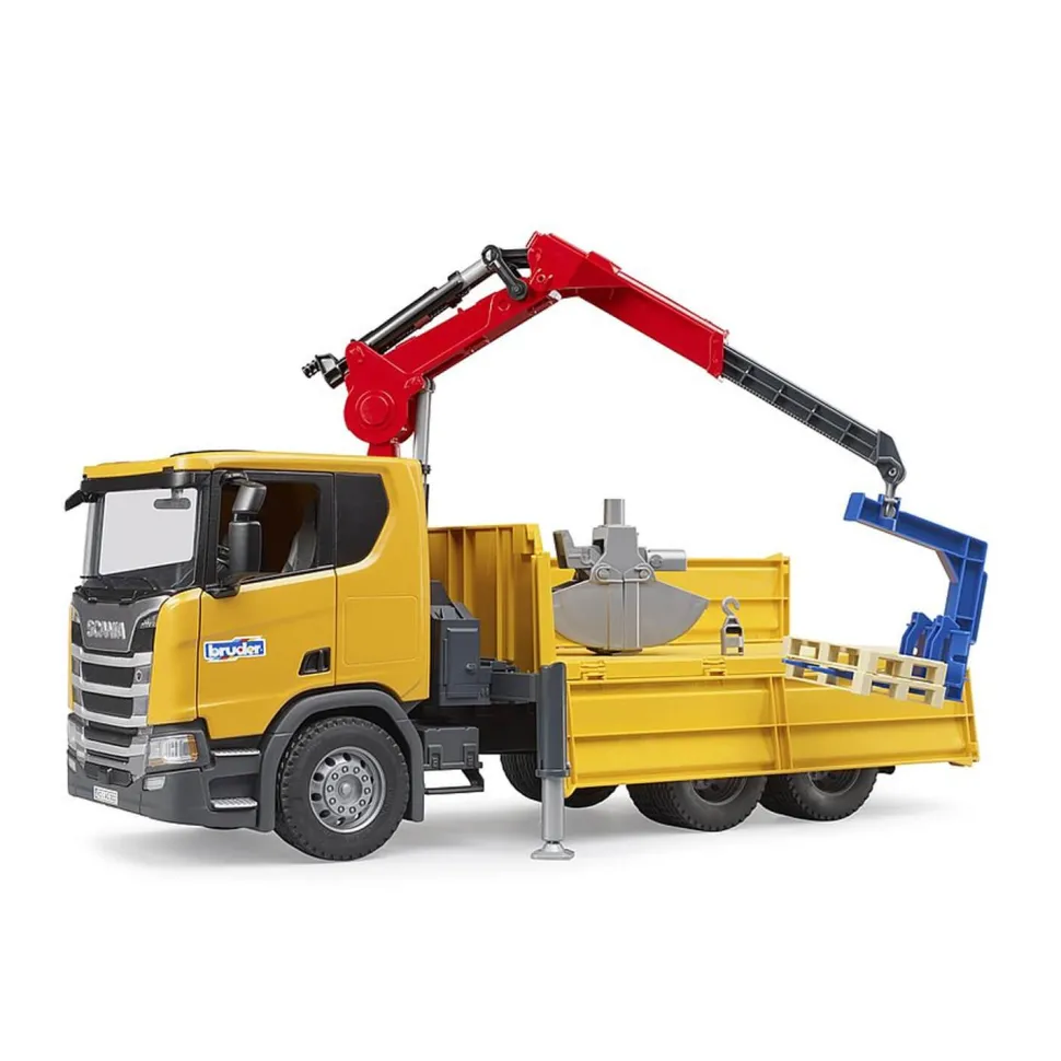 La cabine du véhicule arbore le design typique et dynamique de Scania. Des rétroviseurs extérieurs rabattables ainsi que des portes pouvant être ouvertes sont inclus. La structure du véhicule se compose d’une surface de chargement basculante avec trois ridelles rabattables. Derrière la cabine se trouve une grue de chargement rotative à 360°, dépliable et télescopique, qui peut être guidée à la main et maintenue dans n’importe quelle position en verrouillant le dispositif de fixation. De plus, des renforts télescopiques et abaissables sont positionnés sur le côté de la grue de chargement afin de conférer davantage de stabilité au véhicule lors du chargement. Une fourche à palettes avec deux palettes et une benne preneuse étant également fournies, le jeu peut commencer sans tarder.
