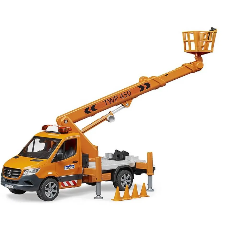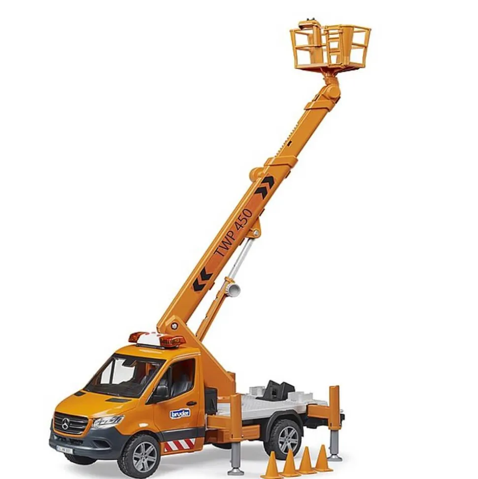 La toute dernière version de BRUDER est le MB Sprinter avec nacelle. Les plateformes de travail mobiles sont nécessaires pour effectuer des travaux en hauteur, par exemple sur des arbres, des éclairages de rue ou des panneaux de signalisation. La plateforme de travail BRUDER permet de placer en toute sécurité chaque figurine bworld jusqu’à une hauteur de 70 cm ! Grâce à une technique intégrée, la nacelle reste constamment en position horizontale lorsque le bras de grue est déployé. Le véhicule est également équipé de 4 appuis télescopiques et de 4 pylônes pour délimiter la zone de travail. Le module son et lumière est déjà installé sur les portes de la cabine du Sprinter, ce qui permet de l’ouvrir et de garantir la sécurité et une bonne visibilité du véhicule.