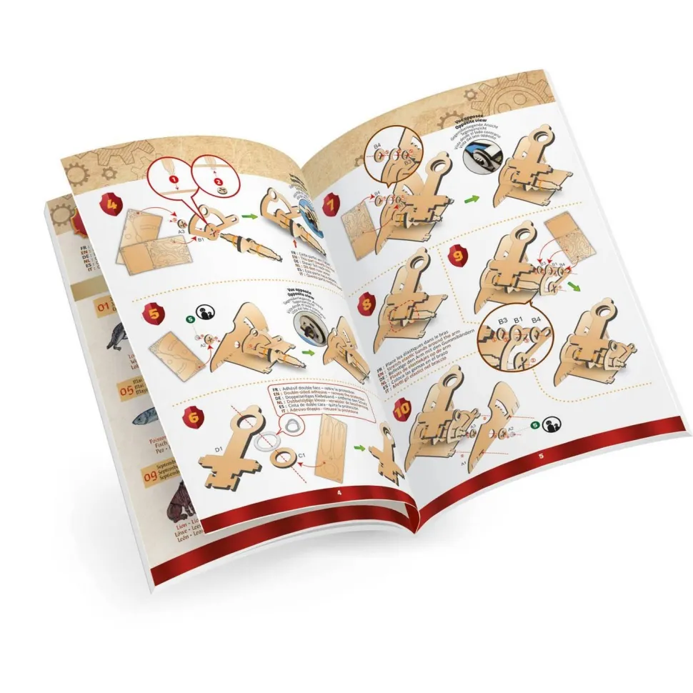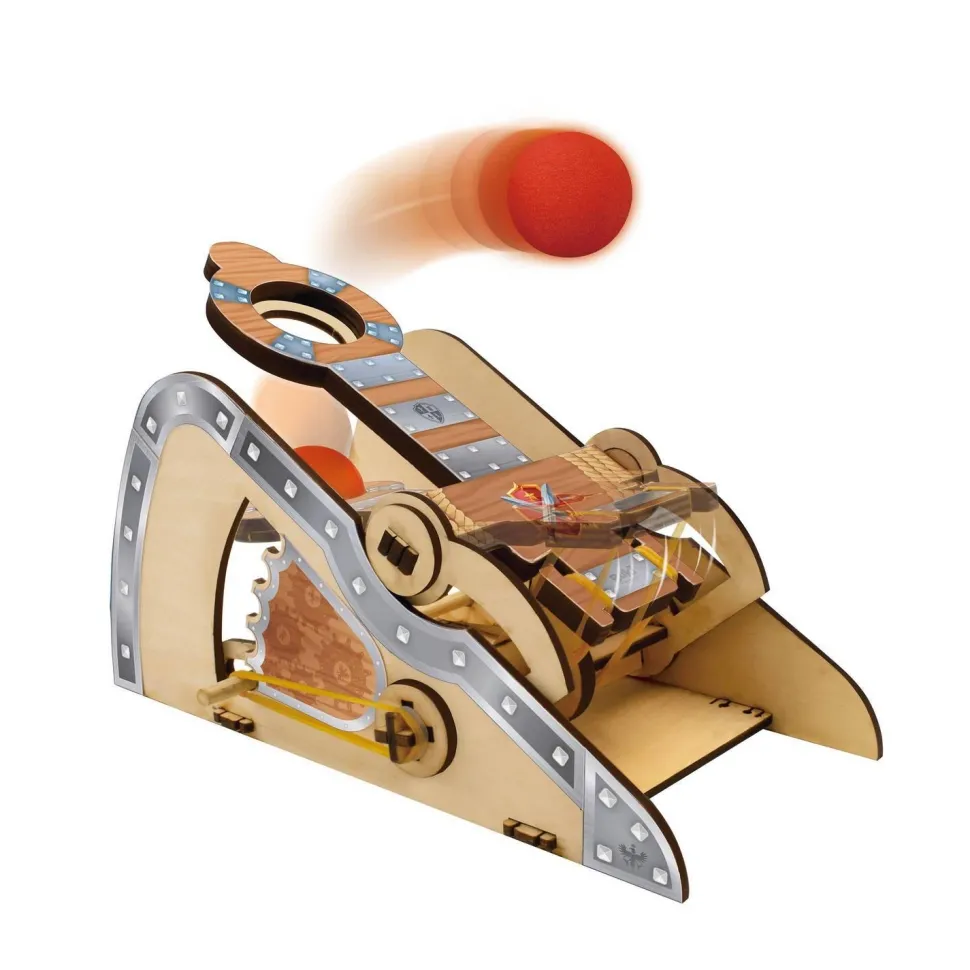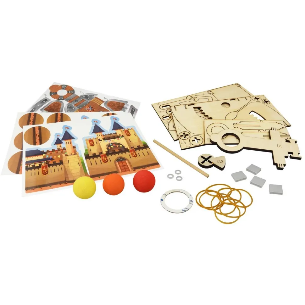 Assemble les pièces en bois pour construire ta catapulte. Montage facile sans colle. Personnalise ta catapulte avec les autocollants.