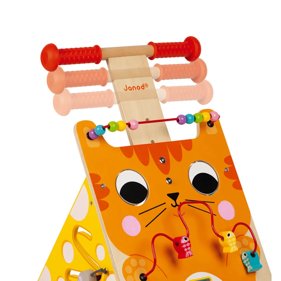 Un chariot multi-activités Janod avec un joli décor de chat très utile aux premiers pas de bébé !