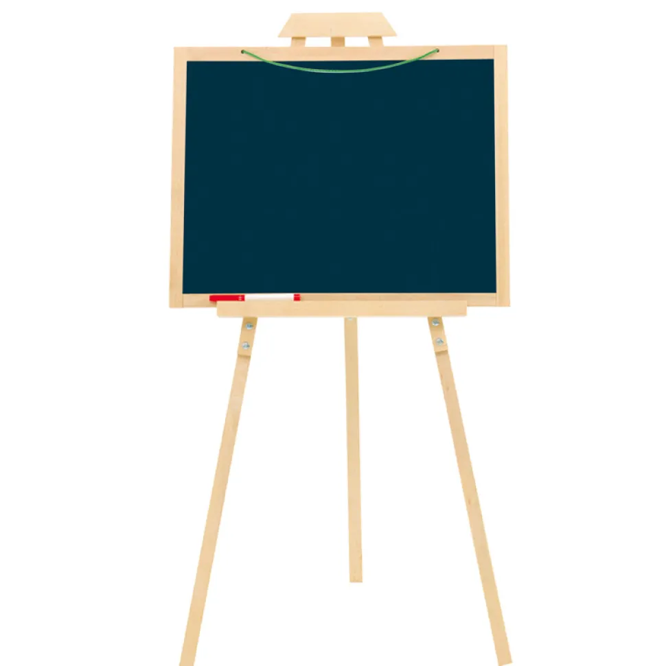Ardoise réversible et à suspendre.Une face noire pour écrire a la craie; une face blanche magnétique pour feutre et lettres aimantées. Accessoires fournis : lettres aimantées, boîte à craie et feutre.Pieds démontables.Hauteur : 105 cm.Dimensions ardoises : 56 x 43 cm.Dimensions de la boîte : 58 x 57 x 5 cm.