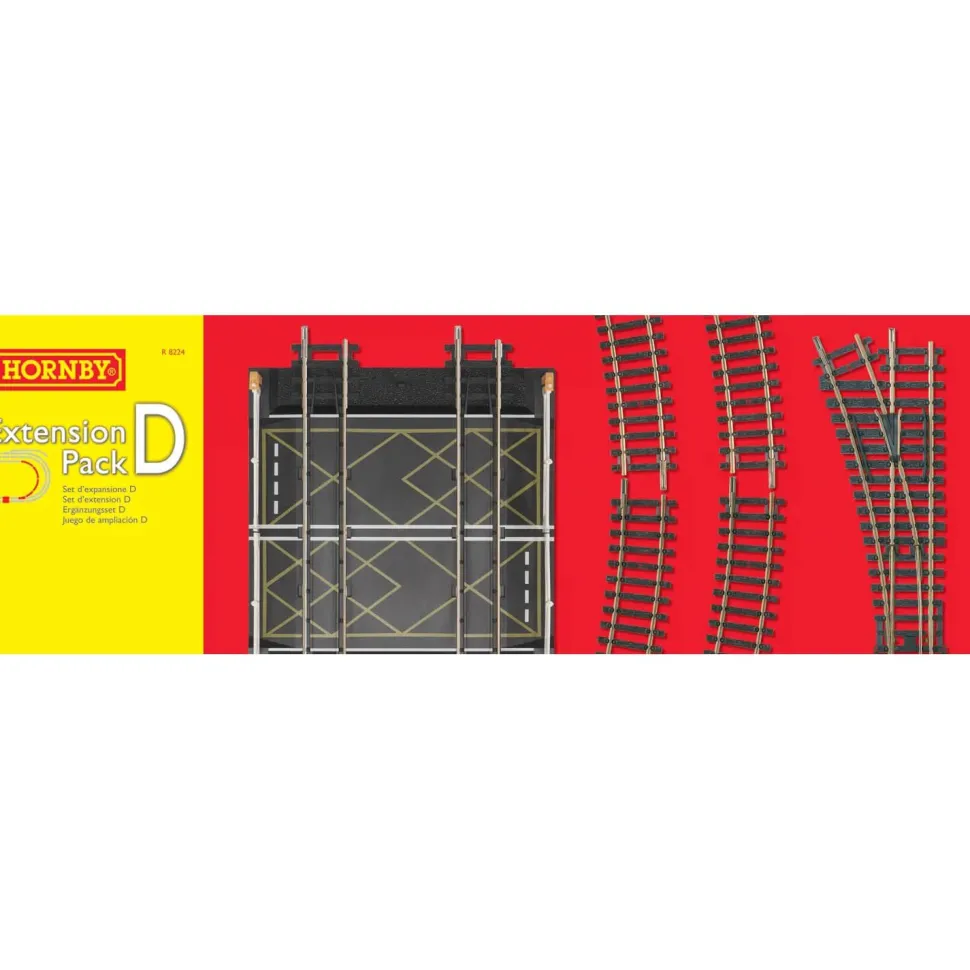 Contenu du pack d’extension de voie D : 1er rail de courbe de rayon (R605) x 3 ; 3ème rail de courbe de rayon (R608) x 1 ; aiguillage à gauche (R8072) x 1 ; butoir (R083) x 1 ; double passage à niveau (X2120) x 1.
