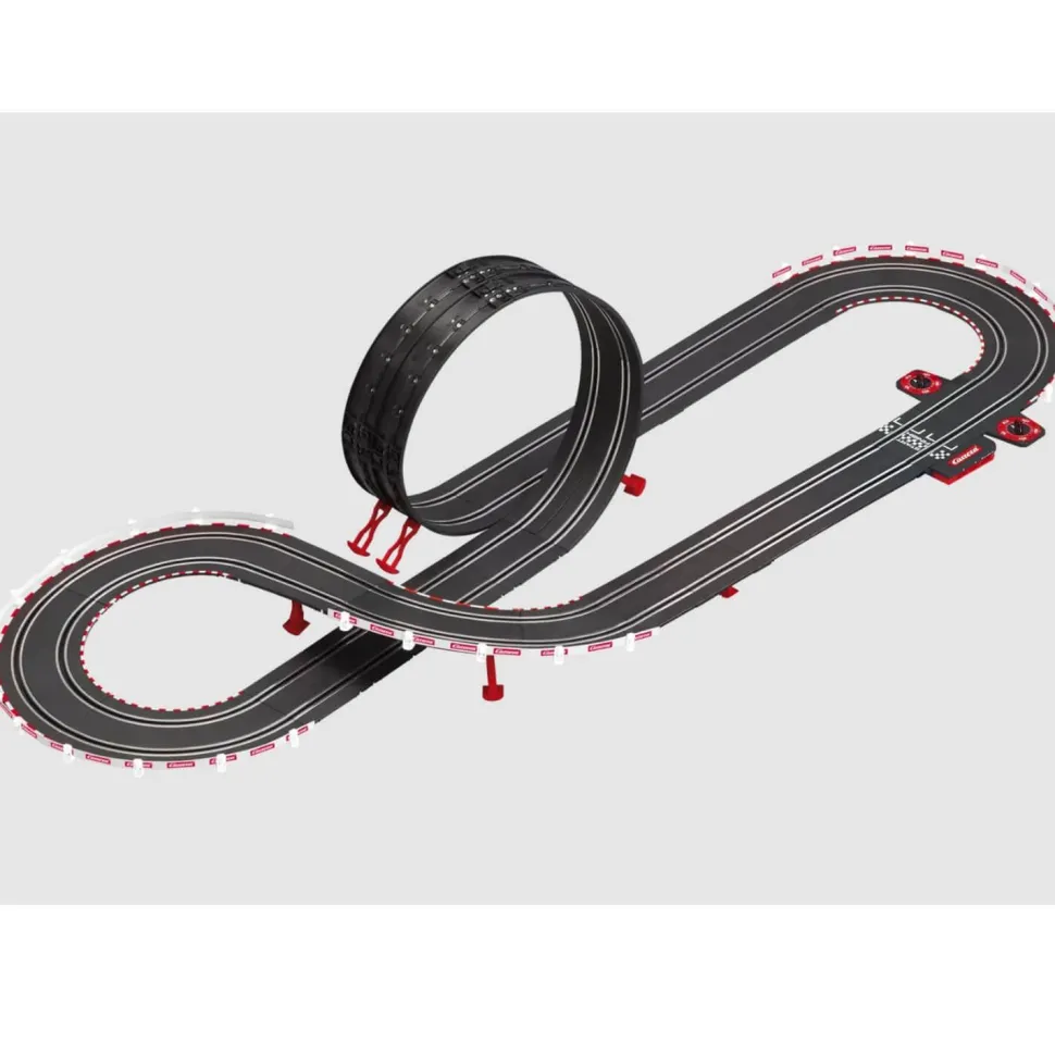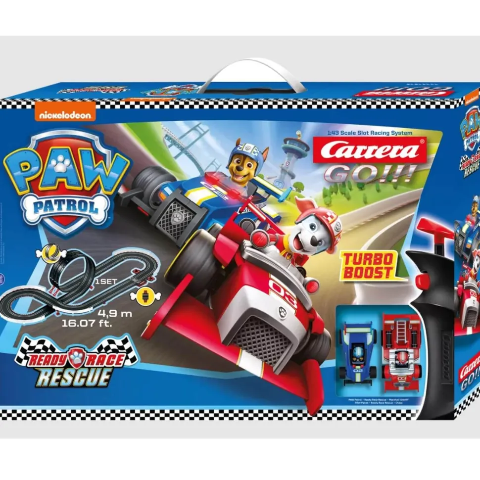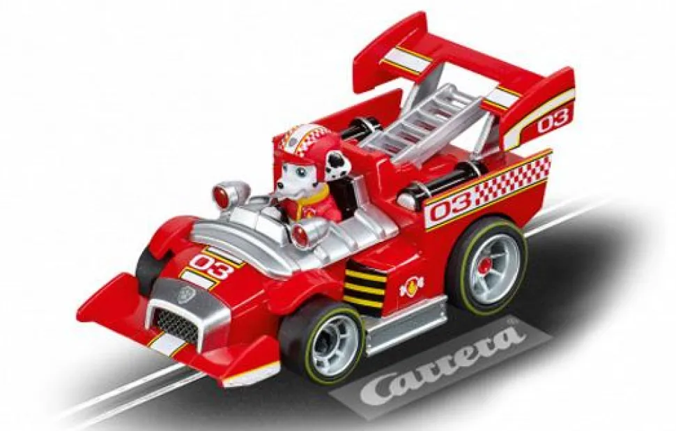 Le circuit de course automobile Carrera GO!!! de 4,9 mètres de long accueille Chase, le héros canin dans une voiture de police bleue accrocheuse, et Marshall, le Dalmatien à l’esprit dispersé dans son gros camion de pompiers rouge. Ensemble, ils garantissent la sécurité et l’ordre dans les chambres et les salles de jeux du monde entier.