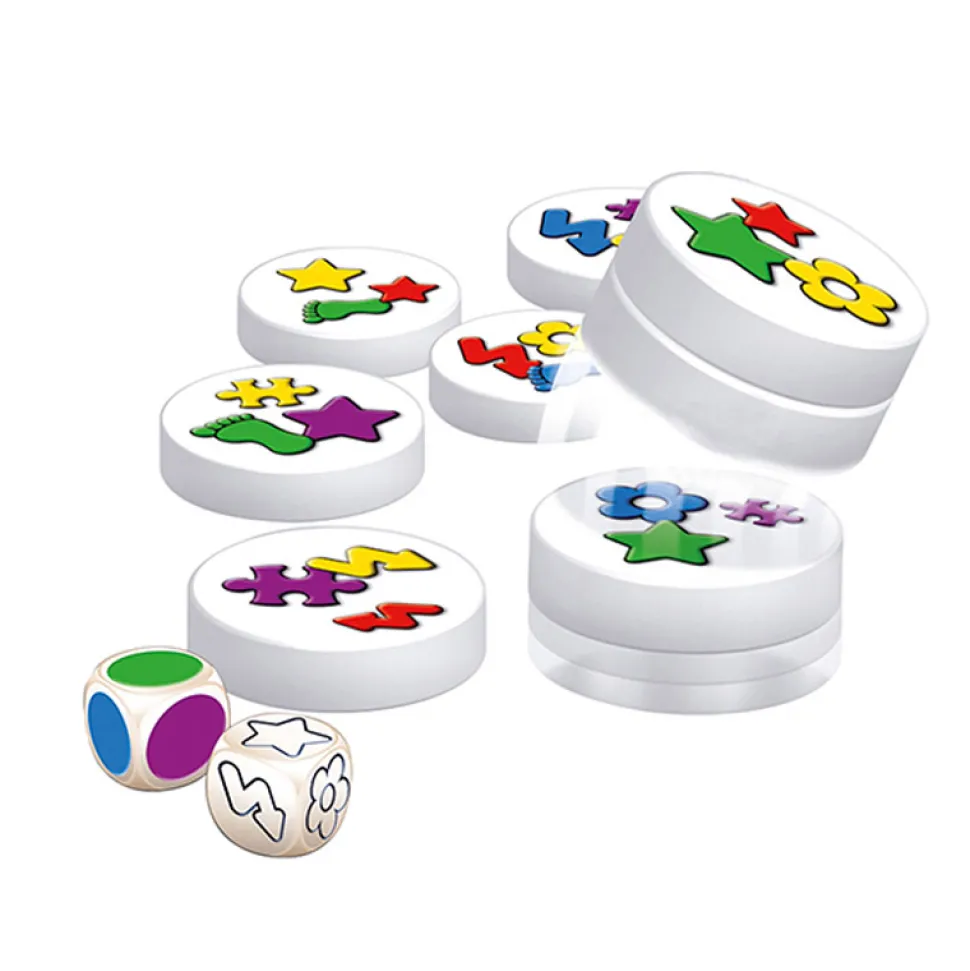 Déclic et des clacs ! Chacun des 36 disques étalés sur la table combine 3 symboles reproduits dans 3 couleurs différentes. A chaque tour, on lance 2 dés qui indiquent quel symbole trouver et dans quelle couleur. Puis tous les joueurs tentent simultanément de s’emparer d’un maximum de disques reproduisant cette combinaison. Les disques sont aimantés : «Clac! Clac ! » ils s’empilent comme par magie, mais on ne peut utiliser qu’une seule main ! Il faut aller très vite pour les empiler sans se tromper, sinon gare aux pénalités… Puis on entame un nouveau tour. Quand tous les disques ont été ramassés, la plus haute pile indique le vainqueur. Ayez l’oeil vif, l’esprit clair et la main habile !Contenu : 32 disques magnétiques, 1 dé Symbole, 1 dé Couleur, règle du jeuDurée de la partie : 10 minutes. Nombre de joueurs : 2 à 6.Dimensions de la boîte : 20 x 20 x 4.5 cm.