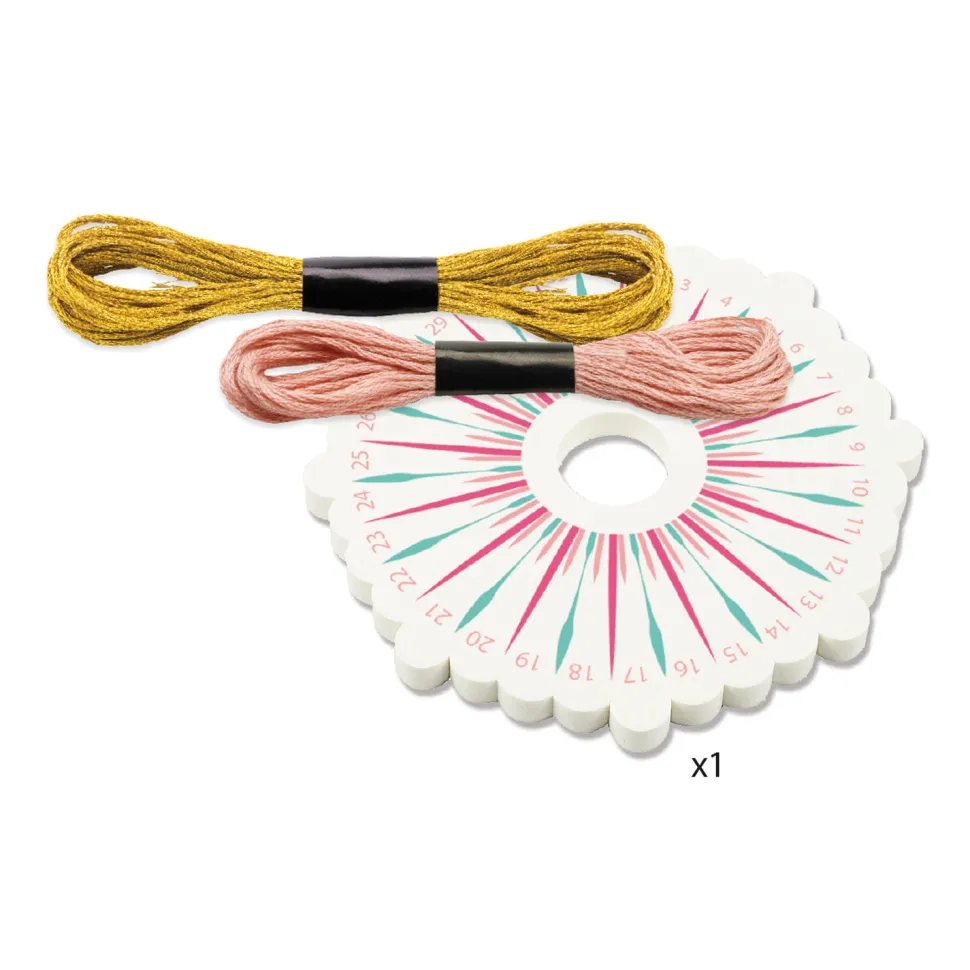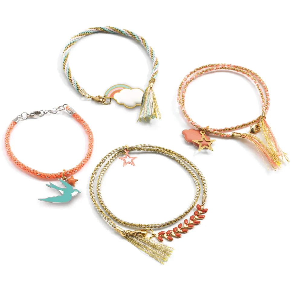 Un coffret créatif pour se créer de jolis bracelets Kumihimo aux couleurs pastels tendances et élégants.Contenu :- des échevettes de fil coloris doré et rose- des anneaux coloris argenté- des anneaux coloris doré- 1 fermoir coloris argenté- 1 fermoir coloris doré- des embouts coloris argenté- des embouts coloris doré- des breloques de formes et couleurs variés (étoiles, oiseau, nuage)- de la chaîne en épi- 1 outil de tressage en mousse Kumihimo- 1 livret pas à pasCe coffret comprend tout le nécessaire pour se confectionner des bracelets Kumihimo, une tendance basée sur un tressage circulaire inspiré de l’art traditionnel de tressage japonais et réalisé à partir d’un disque. A partir de cet outil et des fils fournis, vous pourrez créer des cordons très raffinés que vous pourrez agrémenter avec harmonie de breloques illustrées.