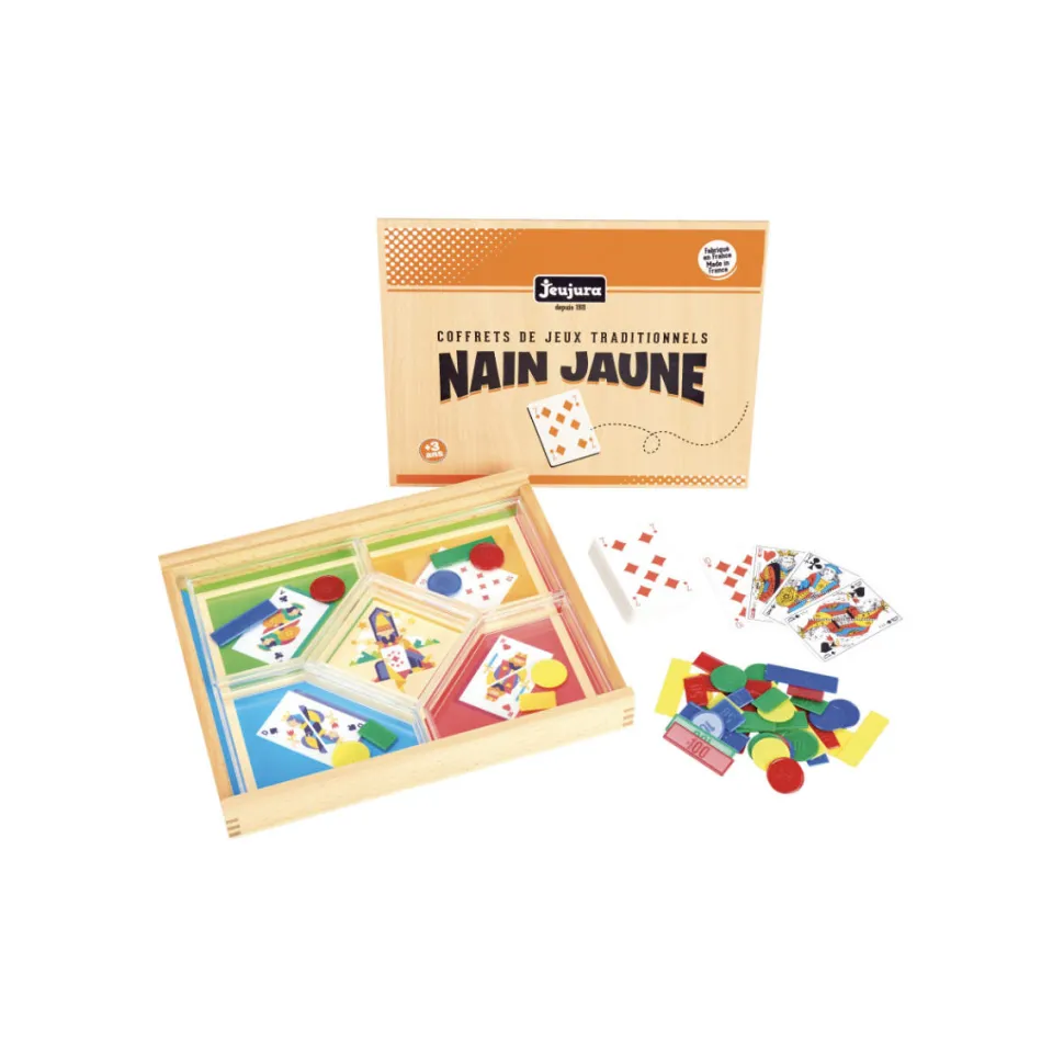 Retrouvez dans ce très joli coffret en bois le jeu du Nain Jaune. C’est un jeu familial intergénérationnel, simple à apprendre et très convivial. A découvrir ou redécouvrir absolument !Contenu :- 1 jeu de 54 cartes- 1 sachet de jetons- des cases amovibles- règle du jeu.Avant de commencer une partie, chacun des joueurs garnit le plateau de la manière suivante :- Le 10 de Carreau : 1 jeton.- Le valet de trèfle : 2 jetons.- La dame de pique : 3 jetons.- Le roi de coeur : 4 jetons.- Le Nain Jaune (ou 7 de carreau) : 5 jetons.Le but de ce jeu est d’être celui qui a le plus de jetons à la fin de la partie !Nombre de joueur : de 3 à 8.Dimensions du coffret en bois sérigraphié : 30.5 x 4 x 25 cm.