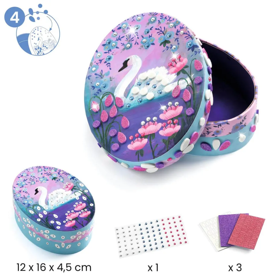 – 1 boîte à bijoux à décorer à l’aide de stickers pierres précieuses et de mousses pailletées, où ranger les 6 bijoux papier réalisés,