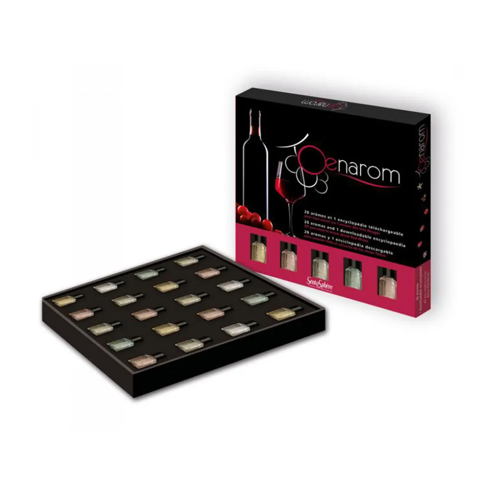 [b]Coffret oenologie Oenarom de chez Sentosphere/b]Avec 20 références olfactives et des liens interactifs, ce produit vous permettra de mieux appréhender l’univers complexe de l’oenologie. Vous y trouverez toutes les informations sur les arômes, les mécanismes de la dégustation et de la vinification, un livre de cave, l’histoire des cépages ou encore toutes les cartes avec les lieux de production. Oenarom est donc le coffret de référence que tout oenologue doit posséder. 20 arômes contenus dans le coffret et 1 encyclopédie téléchargeable : banane, cacao, café, cannelle, caramel, cassis, cerise, champignon, cuir, fraise, framboise, gibier, poivre, pruneau, réglisse, sous-bois, tabac, truffe, vanille, violette. Dimensions : 23 x 23 x 2.5 cm. Note : il existe également une version pour les vins blancs (référence : Sentosphere-922).