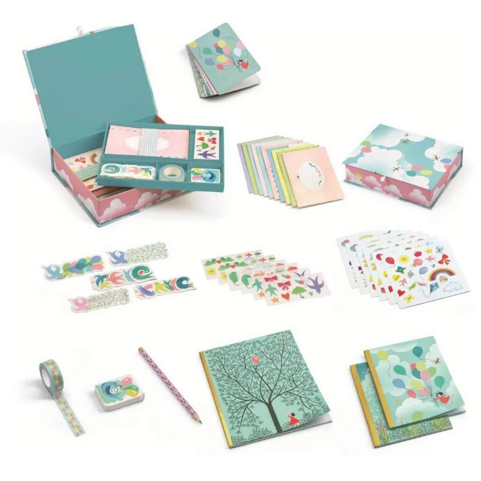 Ce joli coffret remplit de papeterie Lovely Paper de Djeco pour écrire, dessiner ou créer est idéal à partir de 7 ans. La boite est compartimentée et comprend 10 cartes, 10 enveloppes, 6 planches de stickers, 5 marques pages, 6 planches de stickers, un rouleau masking tape, un crayon à papier, une gomme, 2 petits carnets à lignes et un grand cahier ligné poétiquement illustrés.