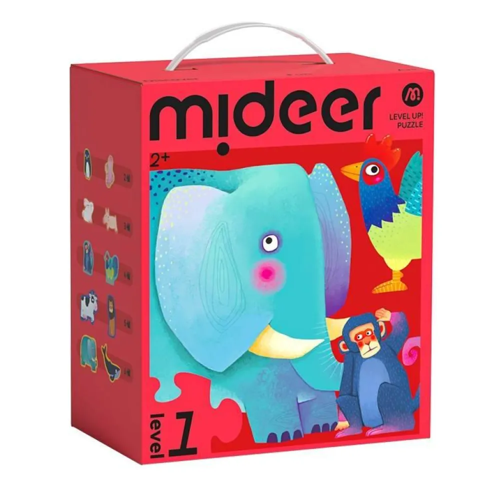 Coffret de Mideer avec 10 puzzles évolutifs en forme d’animaux, parfait dès 2 ans.