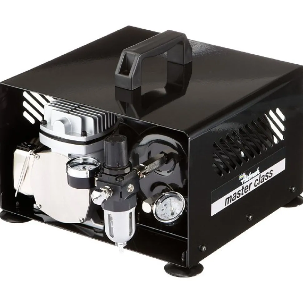 Compresseur à piston sans huile 2 cylindres. 4,4 bars environ de pression maxi. Environ 32 litres d’air à la minute. Niveau sonore environ 50db. 2 manomètres. Régulateur de pression – Purgeur de condensation – Soupape de sécurité, dispositif d’arrêt automatique – Approprié à tous les pistolets aérographes Revell. 220/240 V. 50 Hz. 145 W.