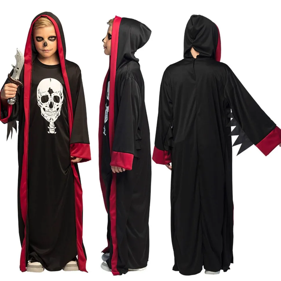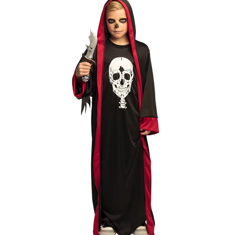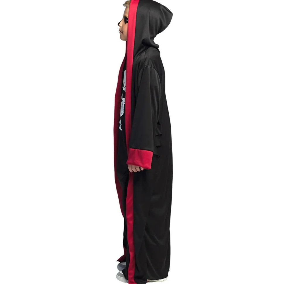 Ce superbe déguisement est composé d’une longue robe avec un motif blanc de tête de mort. La longue cape est cousue à la robe. La cape a des manches longues et des grandes bandes rouges bordent les coutures.