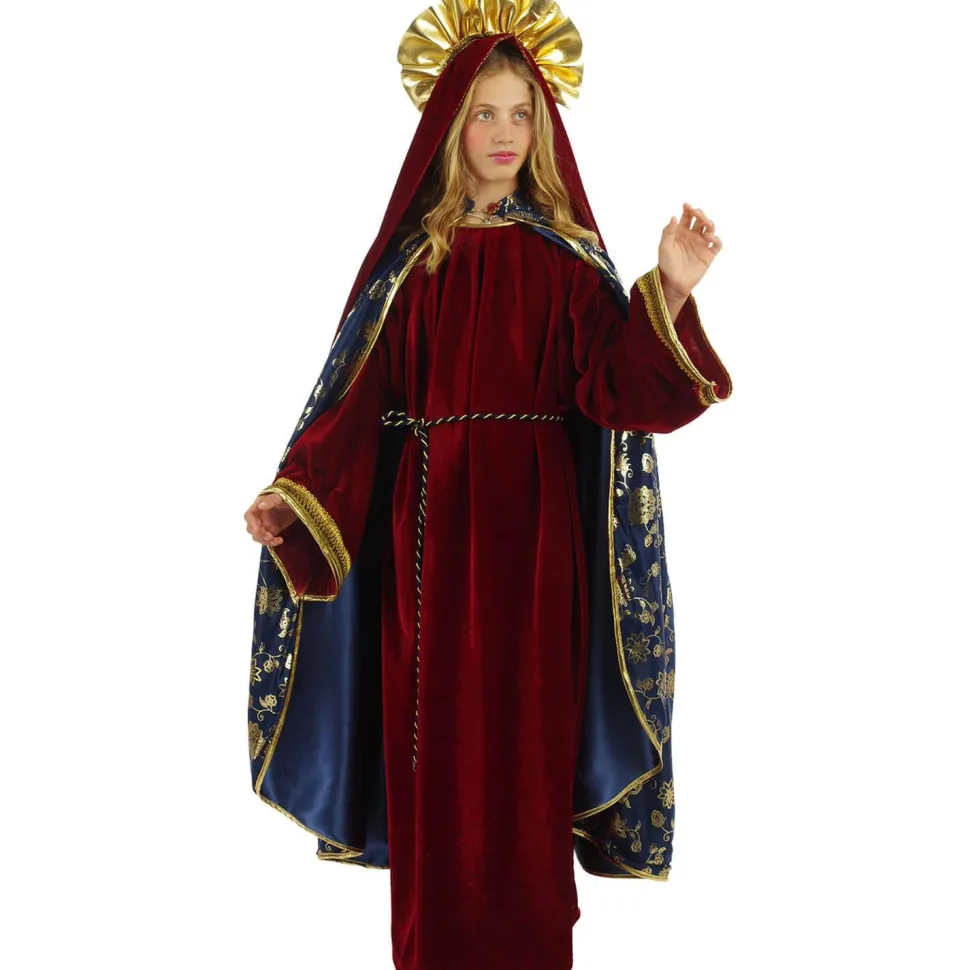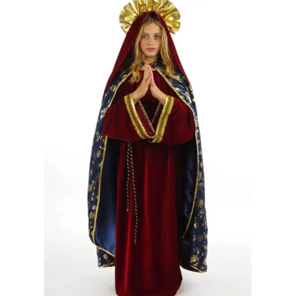 Ce déguisement est composé d’une belle robe longue en velours bordeaux avec des manches longues évasées aux bords dorés, agrémentée d’une ceinture en corde dorée à la taille et d’une cape de couleur bleu nuit à motifs floraux dorés. Pour compléter cet ensemble, un foulard en velours rouge avec une auréole dorée viendra couvrir la tête et finaliser le style traditionnel de ce costume.