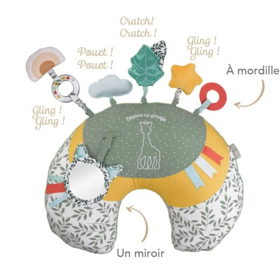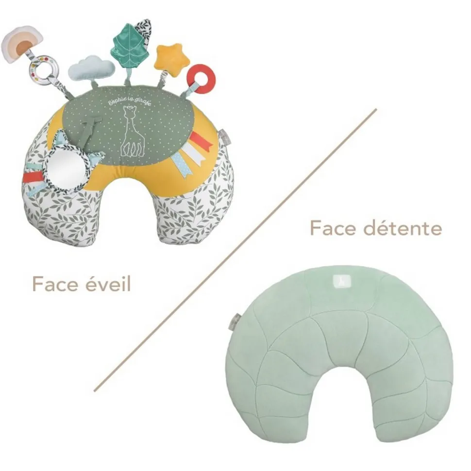 Caractéristiques détaillées : Coussin d’activités 2 en 1 Cosy play – Sophie la Girafe