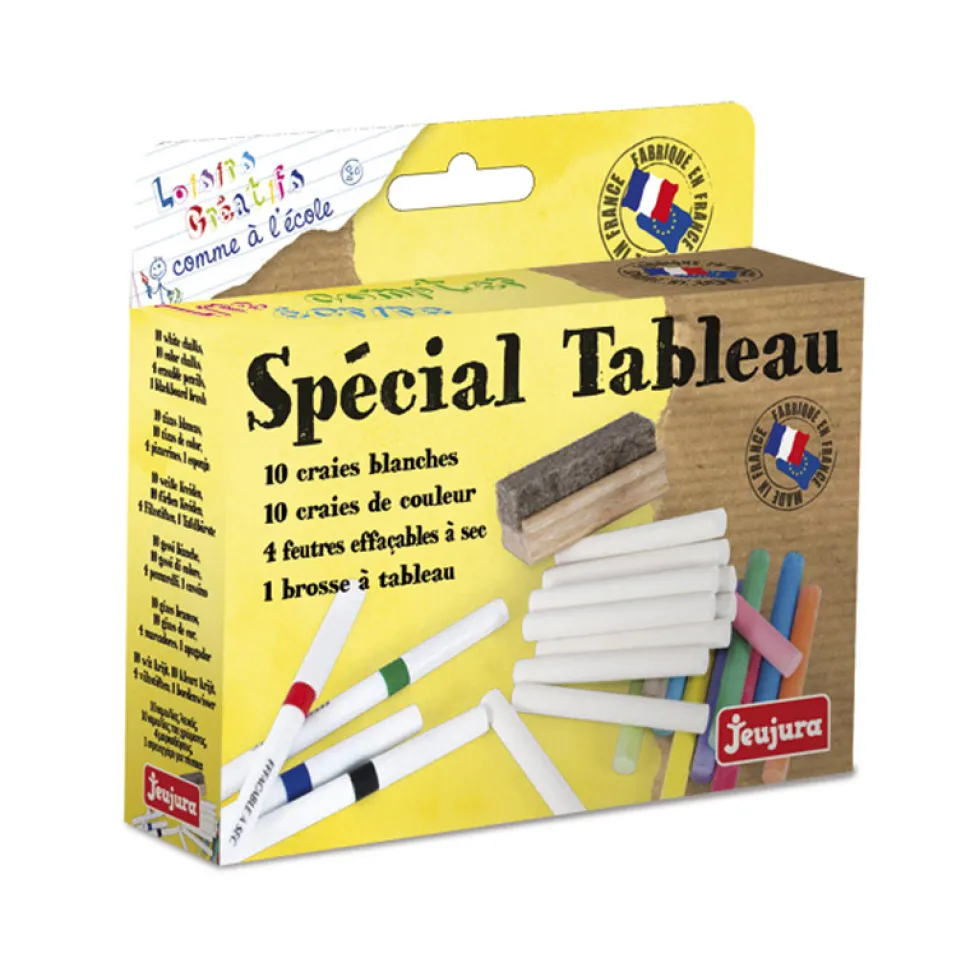 La marque Jeujura vous propose un coffret de craies et feutres avec brosse pour le tableau d’un enfant. Le set est très complet et sera un complément idéal pour un tableau d’enfant. Qu’il soit noir ou blanc, l’enfant sera équipé.Inclus dans la boîte : – 10 craies de couleur (bleu, rose, violet, orange, marron, bleue clair, jaune, vert foncé, vert clair et rouge)- 10 craies blanches- 4 feutres effaçables à sec (rouge, noir, vert, bleu)- 1 brosse à tableau noir Dimensions boite : 17 x 15 x 4 cm.Ce coffret sera très utile pour un enfant qui souhaite jouer avec son tableau. Il propose différentes couleurs qui sauront séduire l’enfant et l’inciter à faire de jolis dessins. Il sera d’ailleurs ravi de montrer à ses parents les créations qu’il aura réalisées !Il pourra également faire ses leçons sur le tableau de manière plus agréable en y ajoutant quelques touches de couleur. Apprendre à calculer, à écrire et même à lire ne sera plus une tâche désagréable pour lui. Il prendra beaucoup de plaisir à faire ses devoirs. Si jamais il se trompe, il pourra effacer son erreur avec la petite brosse à tableau. Elle est similaire à celle que l’on trouve dans les écoles, et rappellera sans aucun doute, des souvenirs d’école aux parents. La taille de la brosse est adaptée à la taille d’une main d’enfant.L’enfant sera heureux de pouvoir utiliser sur son beau tableau, les craies blanches et couleur, les crayons et la brosse pour recommencer autant de fois qu’il le souhaite, à dessiner ou écrire ce qui lui passe par la tête.