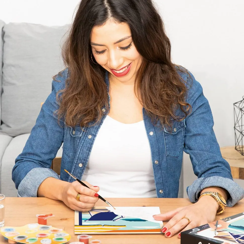 Contenu : 1 tableau 24×30 cm, 9 pots de peinture acrylique à base d’eau, 1 double pinceau, 2 palettes, 1 modèle, 1 attache tableau et 1 vernis brillant.