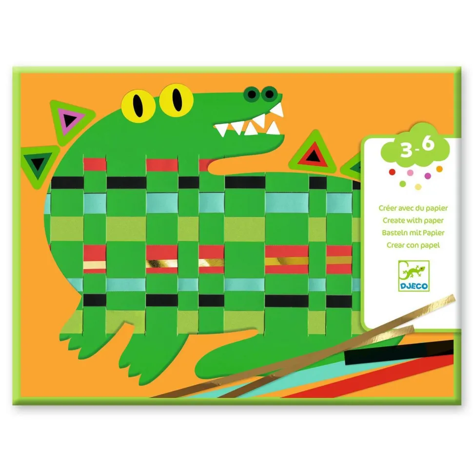 La marque Djeco présente Créer avec du papier, Devant-derrière- devant ! Pour chaque animal, l’enfant détache les bandes de papier et, en suivant le livret, il passe les bandes devant, derrière, devant… Il tisse. Il isole ensuite son tissage à l’aide d’un cache en forme d’animal et colle des stickers : et voilà un superbe tableau tissé ! Contenu: 4 fonds avec des rainures, pour tisser. 4 caches et des stickers double-face pour isoler le tissage. 4 feuilles prédécoupées, avec des bandes de papier pour tisser et une feuille dorée prédécoupée. Des gommettes pour embellir le tout. Un livret explicatif. Un produit en papier et carton certifié FSC®. A partir de 3 ans.