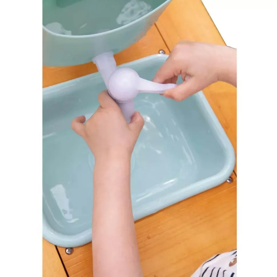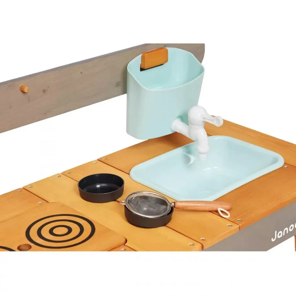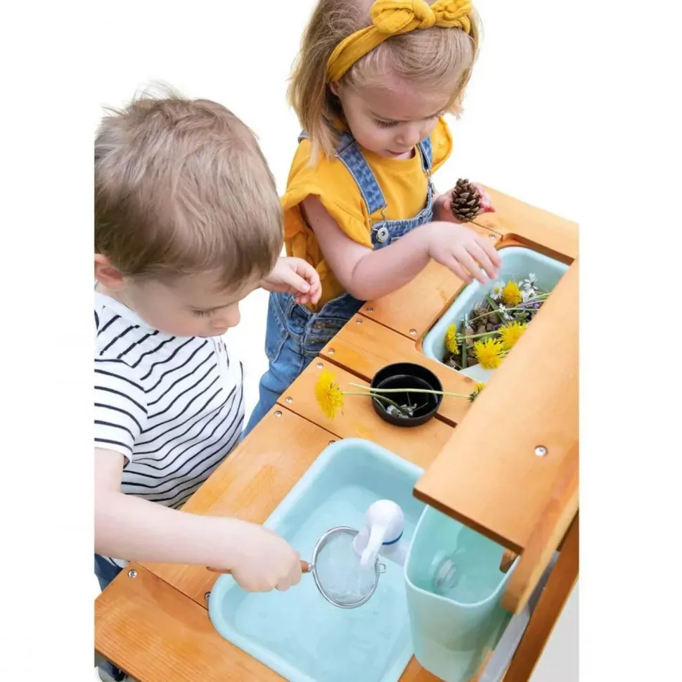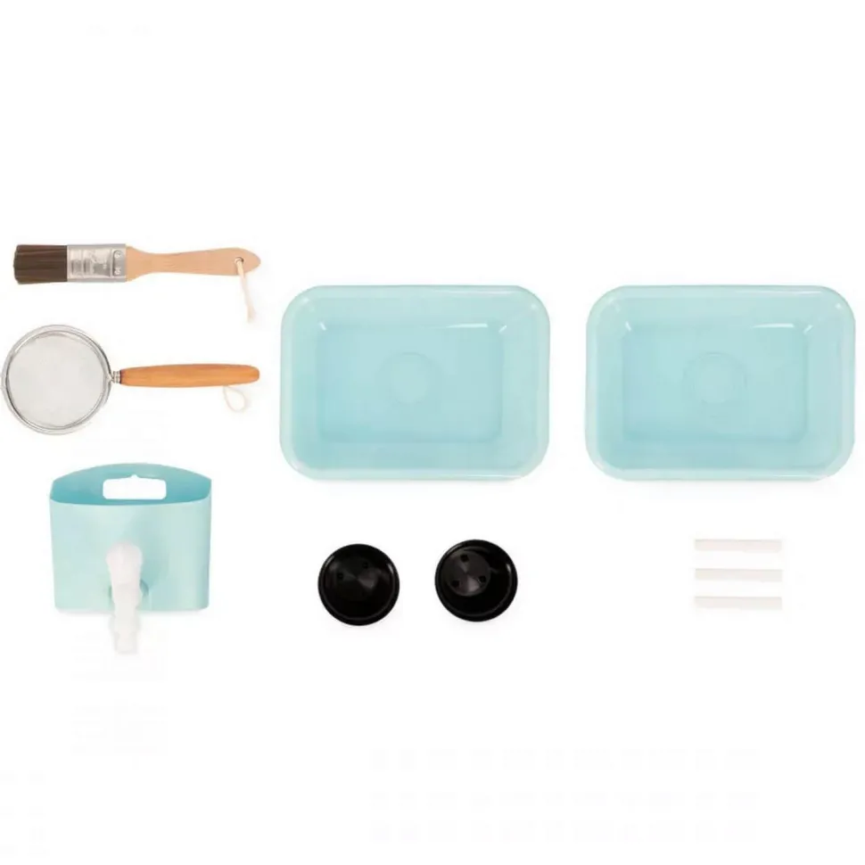 Ce véritable laboratoire de découverte de la nature est parfaitement équipé pour satisfaire tous les aventuriers des jardins grâce à ses 2 éviers et 2 petits pots amovibles en plastique permettant de partir à la recherche d’ingrédients de potions secrètes ! Un vrai robinet permet de passer au nettoyage facilement : il suffit de le remplir le bac puis d’ouvrir le robinet de droite à gauche pour laisser l’eau s’écouler ! Pour faciliter les recherches de votre petit explorateur, un tamis en métal et un pinceau sont également mis à sa disposition.