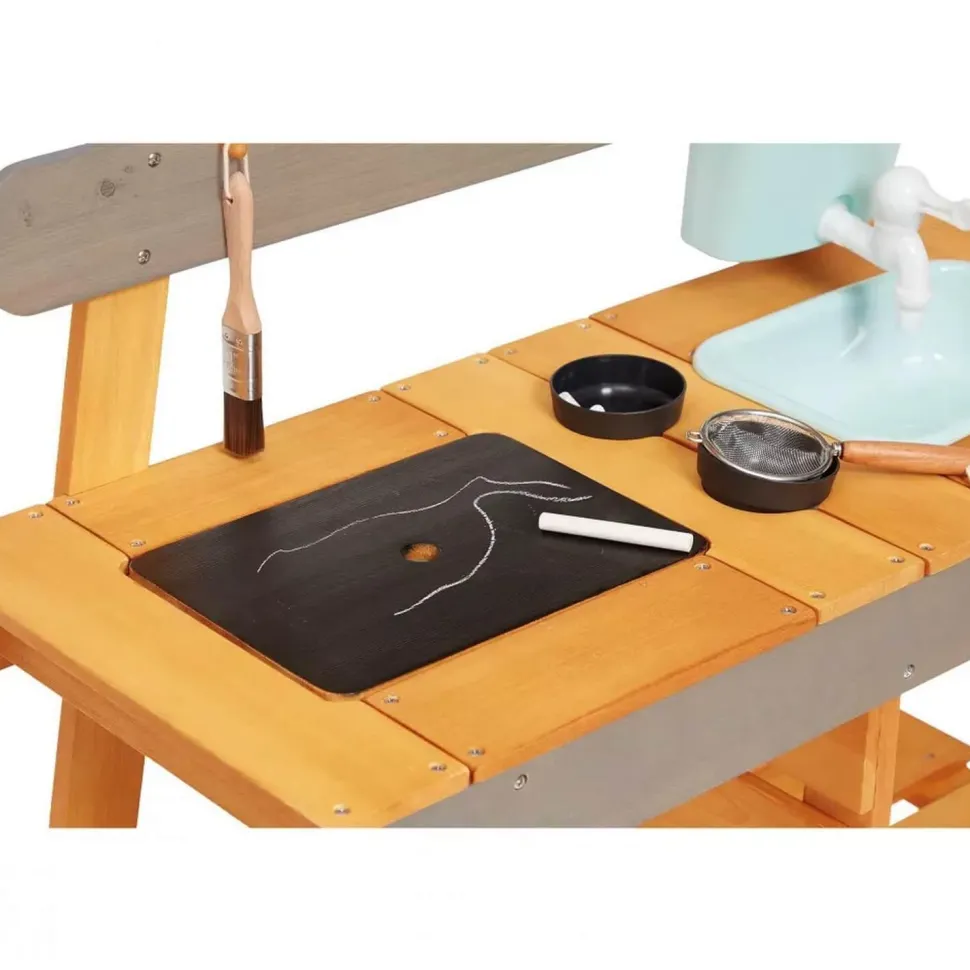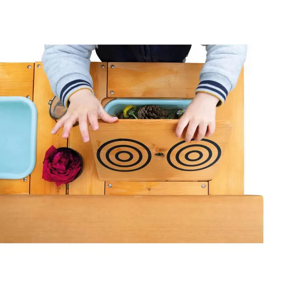 Une fois l’emplacement idéal trouvé dans le jardin ou sur une terrasse, il n’y a plus qu’à mettre son imagination en action pour s’amuser avec la richesse de la nature et tout ce qui nous entoure ! Un peu de terre, quelques brins d’herbe, de l’eau, de jolies fleurs … on mélange, on fait ses propres expériences, on observe et on apprend en s’amusant ! Et pourquoi ne pas préparer ses propres plantations sur cet établi d’extérieur ou table de rempotage ? On peut tout imaginer avec ce jouet d’imitation en pin spécialement traité pour l’extérieur.