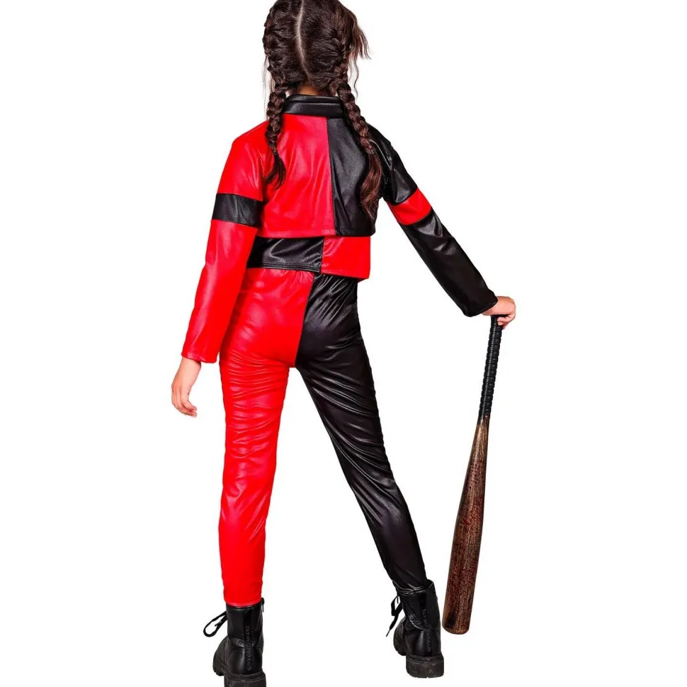 Ce costume se compose d’une combinaison moulante bicolore rouge et noire inspirée des bouffons, avec un col blanc et une batte de baseball.