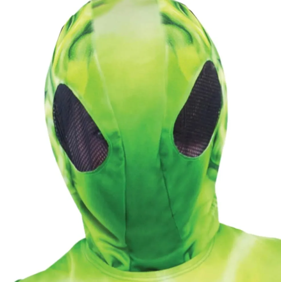 Ce déguisement comprend une combinaison verte en polyester extensible avec des veines translucides imprimées et des entrailles extraterrestres. Une capuche et un masque imprimés attachés mettent un visage sur ce costume extraterrestre tandis que les gants inclus couvrent vos mains terrestres.