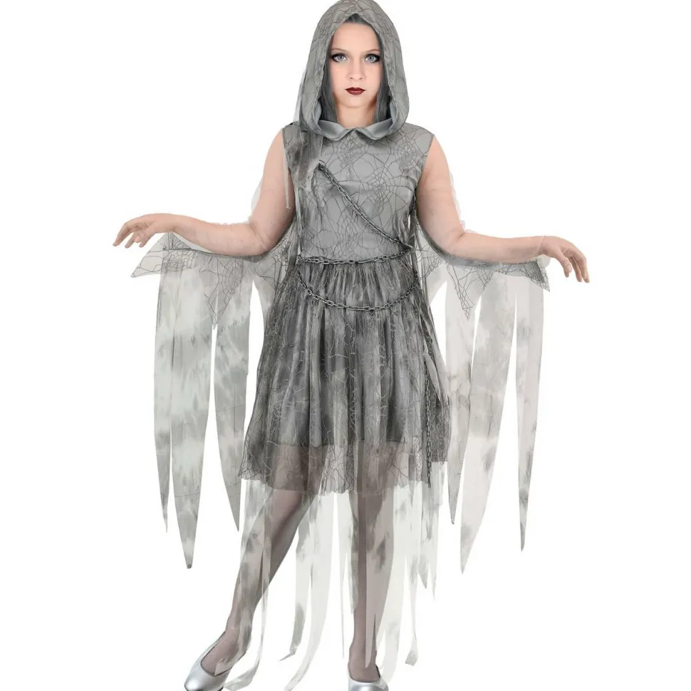 Ce costume se compose d’une robe grise en tulle effiloché, d’un voile léger sur les épaules et les bras, et s’accompagne d’une chaine en guise de ceinture pour un effet fantôme.