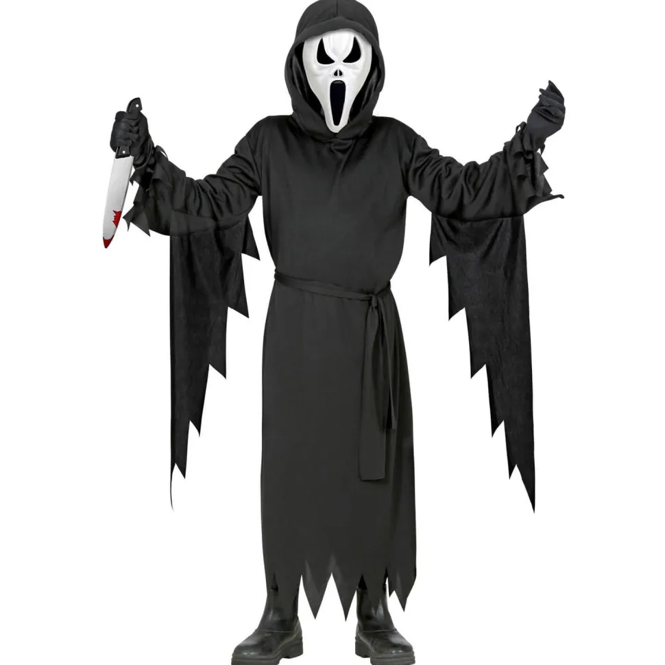Ce déguisement est parfait pour un enfant, tout comme pour un ado. Ce déguisement entièrement noir est composé d’une longue tunique à manches langues et à capuche avec de larges extrémités découpées au niveau des bras, une ceinture, et un masque blanc très expressif. Vous pourrez alors dissimuler complètement votre identité et grâce à votre air méchant, sortez dans les rues le soir d’Halloween et amusez-vous à effrayer toutes les âmes qui ont le malheur de croiser votre chemin…